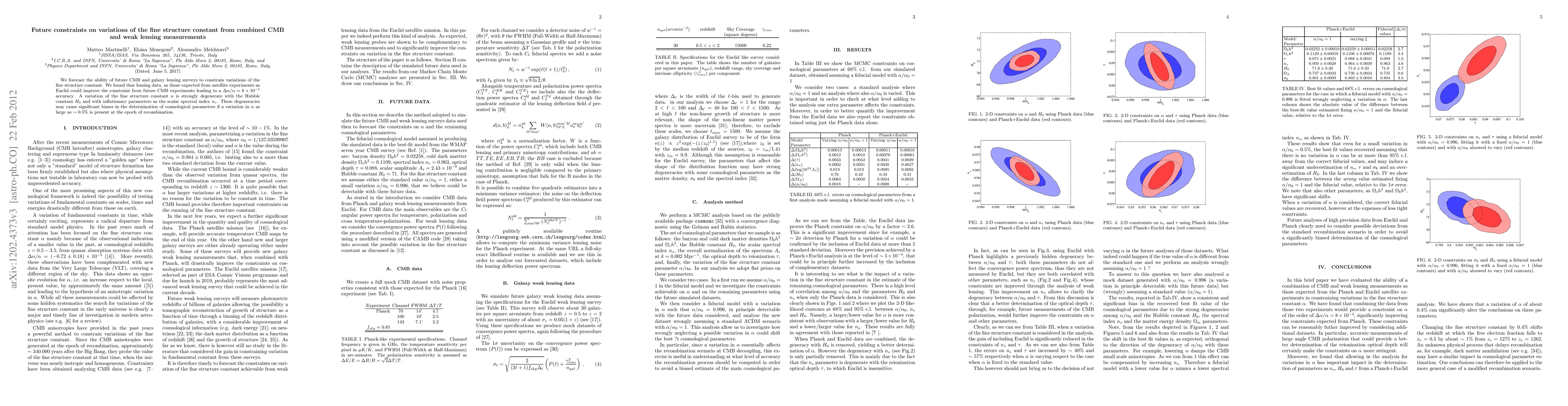 This paper forecasts future constraints on variations of the fine structure constant using combined CMB and weak lensing data, predicting an accuracy of Δα/α = 8 × 10^-4. The study highlights that lensing data from upcoming satellite missions like Euclid could enhance constraints from CMB experiments, but warns of significant degeneracies with the Hubble constant H_0 and inflationary parameters.