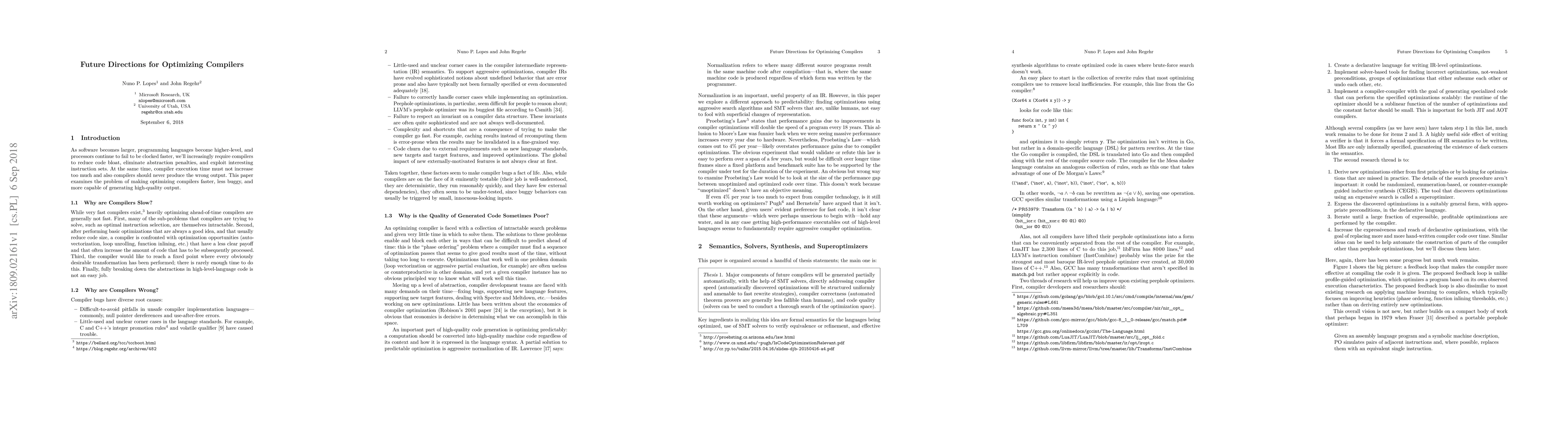 As software becomes larger, programming languages become higher-level, and processors continue to fail to be clocked faster, we'll increasingly require compilers to reduce code bloat, eliminate abstraction penalties, and exploit interesting instruction sets. At the same time, compiler execution time must not increase too much and also compilers should never produce the wrong output. This paper examines the problem of making optimizing compilers faster, less buggy, and more capable of generating high-quality output.