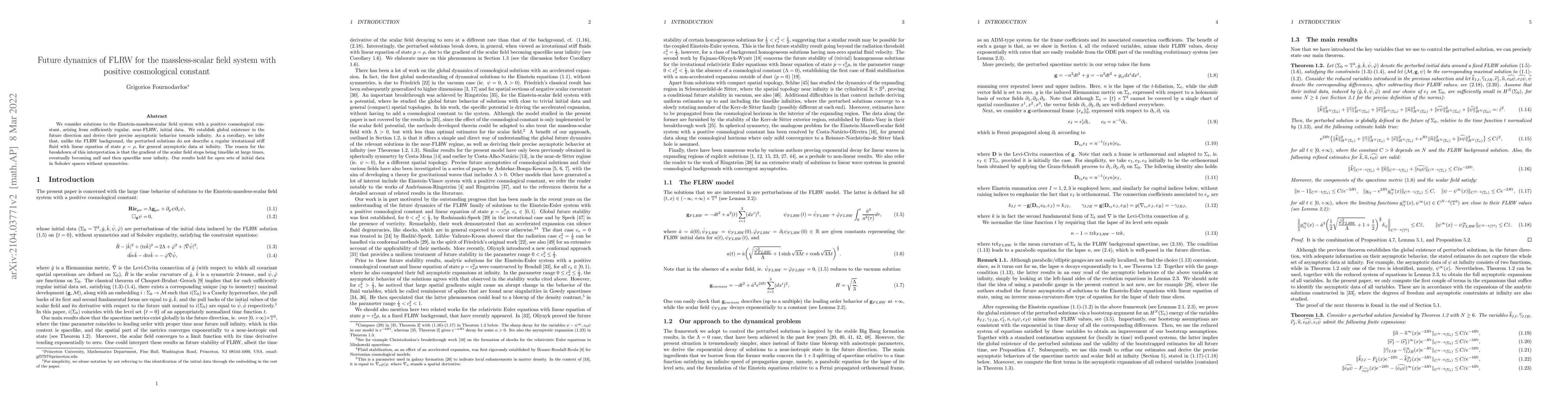 We consider solutions to the Einstein-massless-scalar field system with a positive cosmological constant, arising from sufficiently regular, near-FLRW, initial data. We establish global existence in the future direction and derive their precise asymptotic behavior towards infinity. As a corollary, we infer that, unlike the FLRW background, the perturbed solutions do not describe a regular irrotational stiff fluid with linear equation of state $p=\rho$, for general asymptotic data at infinity. The reason for the breakdown of this interpretation is that the gradient of the scalar field stops being timelike at large times, eventually becoming null and then spacelike near infinity. Our results hold for open sets of initial data in Sobolev spaces without symmetries.