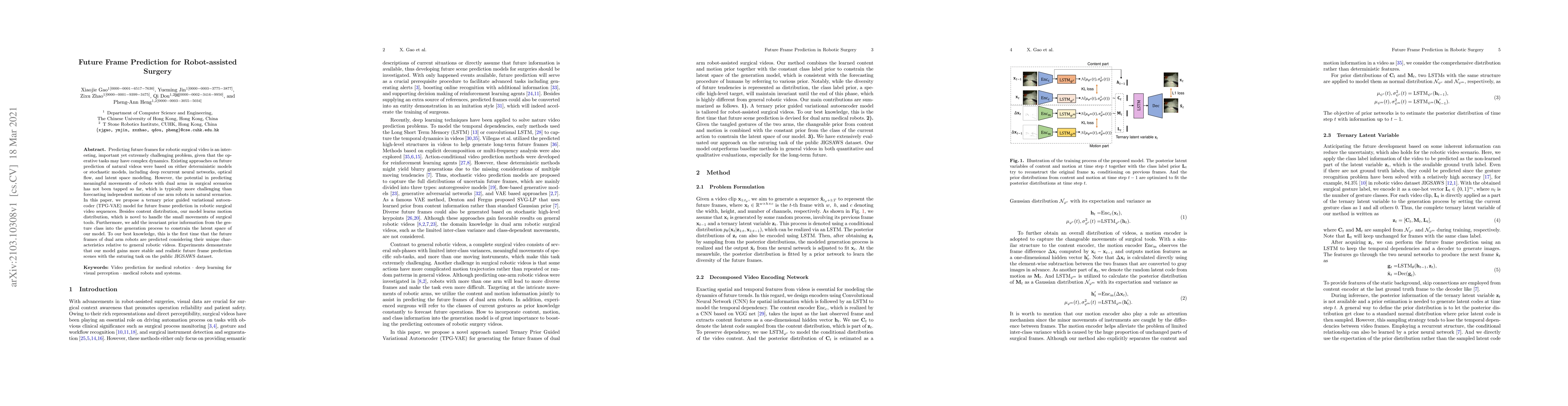 This paper introduces a novel model, TPG-VAE, for predicting future frames in robotic surgical videos, addressing the challenge of complex dual-arm movements. The model learns both content and motion distributions, incorporating gesture class information, leading to more stable and realistic predictions in suturing tasks on the JIGSAWS dataset.
