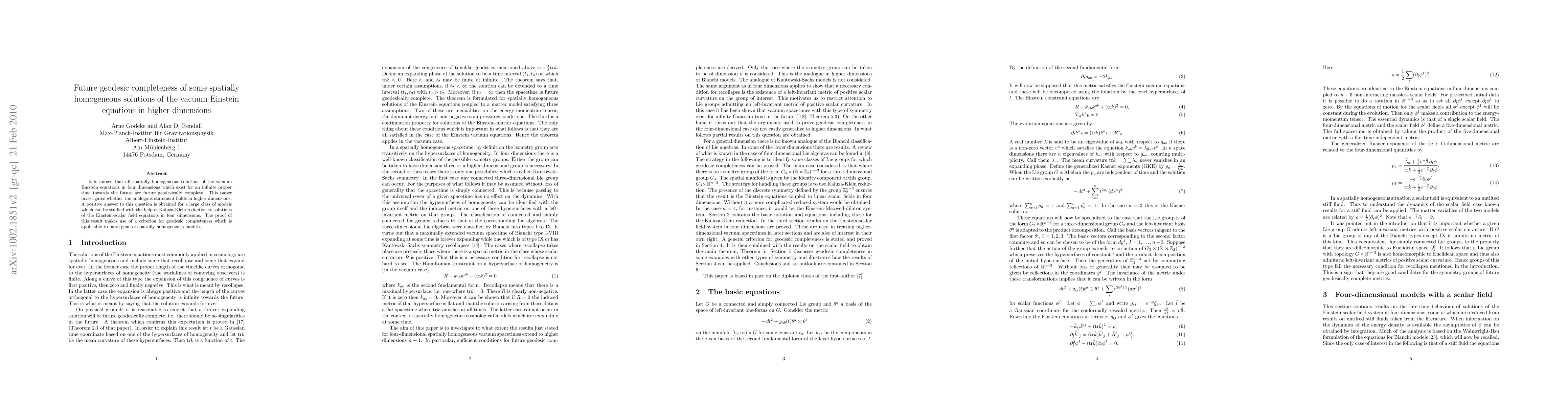 Researchers investigate if spatially homogeneous solutions of vacuum Einstein equations in higher dimensions are future geodesically complete, finding a positive answer for many models using Kaluza-Klein reduction and a new criterion for completeness.
