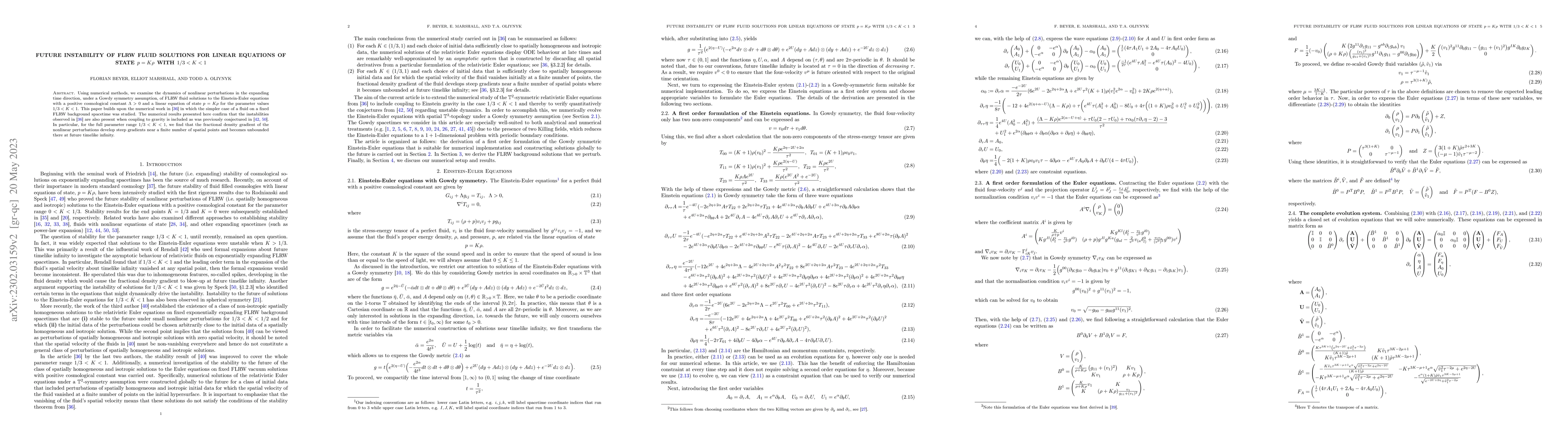 This paper investigates the future instability of FLRW fluid solutions with linear equations of state $p = K\rho$ for $1/3 < K < 1$ under the Gowdy symmetry assumption, confirming that nonlinear perturbations develop steep gradients and become unbounded at future timelike infinity, challenging the standard cosmological expansion model.
