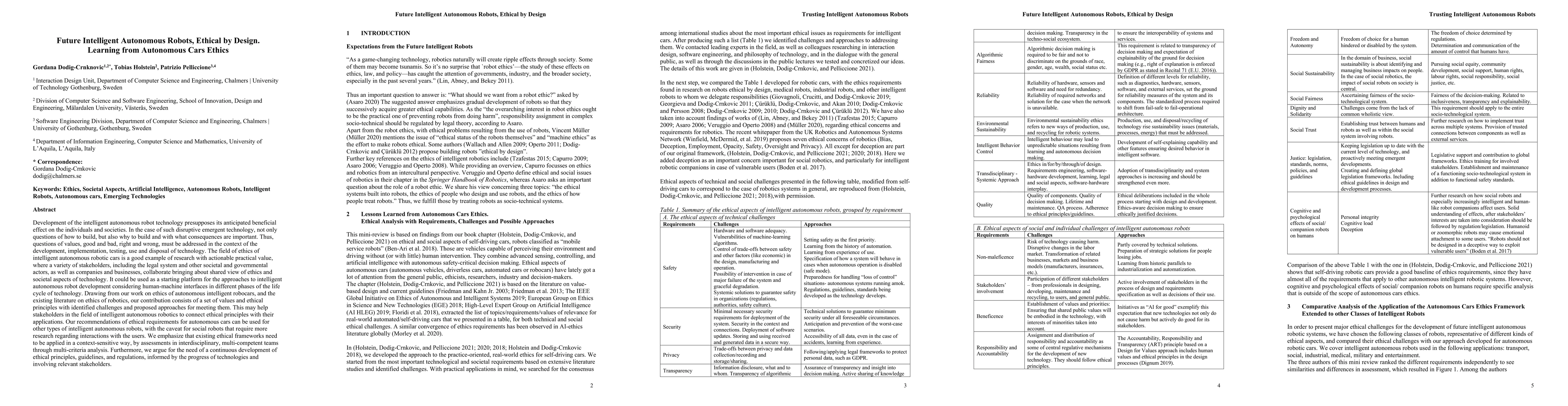 Development of the intelligent autonomous robot technology presupposes its anticipated beneficial effect on the individuals and societies. In the case of such disruptive emergent technology, not only questions of how to build, but also why to build and with what consequences are important. The field of ethics of intelligent autonomous robotic cars is a good example of research with actionable practical value, where a variety of stakeholders, including the legal system and other societal and governmental actors, as well as companies and businesses, collaborate bringing about shared view of ethics and societal aspects of technology. It could be used as a starting platform for the approaches to the development of intelligent autonomous robots in general, considering human-machine interfaces in different phases of the life cycle of technology - the development, implementation, testing, use and disposal. Drawing from our work on ethics of autonomous intelligent robocars, and the existing literature on ethics of robotics, our contribution consists of a set of values and ethical principles with identified challenges and proposed approaches for meeting them. This may help stakeholders in the field of intelligent autonomous robotics to connect ethical principles with their applications. Our recommendations of ethical requirements for autonomous cars can be used for other types of intelligent autonomous robots, with the caveat for social robots that require more research regarding interactions with the users. We emphasize that existing ethical frameworks need to be applied in a context-sensitive way, by assessments in interdisciplinary, multi-competent teams through multi-criteria analysis. Furthermore, we argue for the need of a continuous development of ethical principles, guidelines, and regulations, informed by the progress of technologies and involving relevant stakeholders.