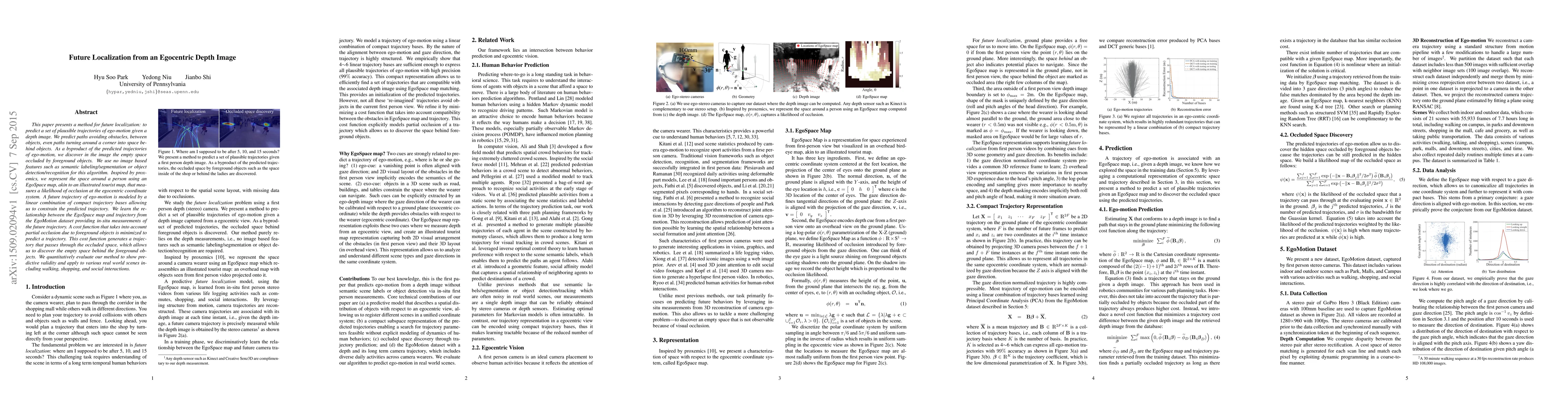 This paper presents a method for future localization: to predict a set of plausible trajectories of ego-motion given a depth image. We predict paths avoiding obstacles, between objects, even paths turning around a corner into space behind objects. As a byproduct of the predicted trajectories of ego-motion, we discover in the image the empty space occluded by foreground objects. We use no image based features such as semantic labeling/segmentation or object detection/recognition for this algorithm. Inspired by proxemics, we represent the space around a person using an EgoSpace map, akin to an illustrated tourist map, that measures a likelihood of occlusion at the egocentric coordinate system. A future trajectory of ego-motion is modeled by a linear combination of compact trajectory bases allowing us to constrain the predicted trajectory. We learn the relationship between the EgoSpace map and trajectory from the EgoMotion dataset providing in-situ measurements of the future trajectory. A cost function that takes into account partial occlusion due to foreground objects is minimized to predict a trajectory. This cost function generates a trajectory that passes through the occluded space, which allows us to discover the empty space behind the foreground objects. We quantitatively evaluate our method to show predictive validity and apply to various real world scenes including walking, shopping, and social interactions.