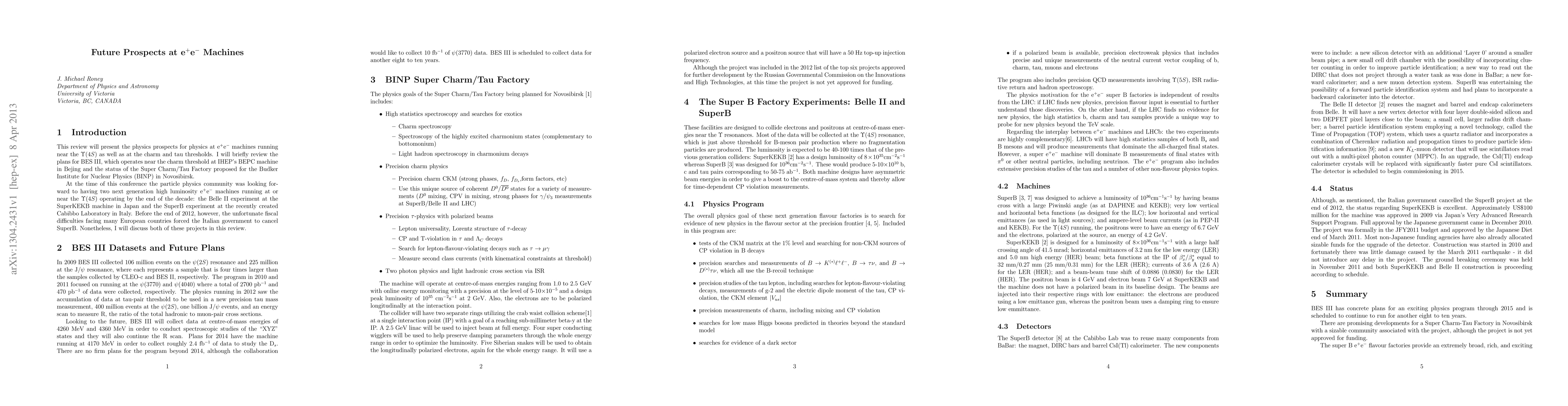 This review explores future physics prospects at electron-positron colliders, focusing on Belle II, SuperB, BES III, and the Super Charm/Tau Factory, highlighting advancements and plans near the Upsilon(4S), charm, and tau thresholds.