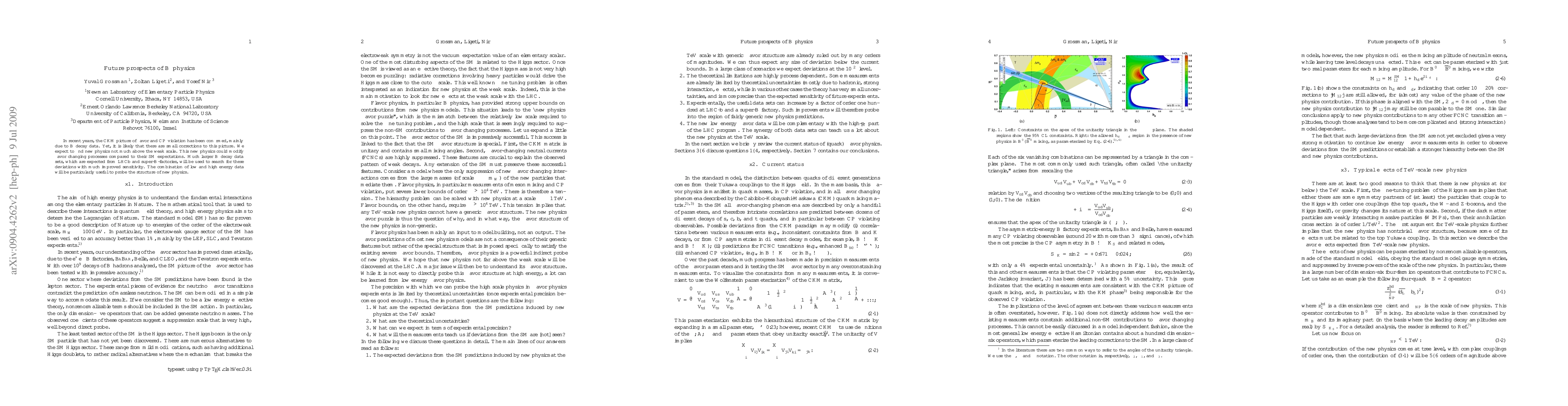 In recent years, the CKM picture of flavor and CP violation has been confirmed, mainly due to B decay data. Yet, it is likely that there are small corrections to this picture. We expect to find new physics not much above the weak scale. This new physics could modify flavor changing processes compared to their SM expectations. Much larger B decay data sets, which are expected from LHCb and super-$B$-factories, will be used to search for these deviations with much improved sensitivity. The combination of low and high energy data will be particularly useful to probe the structure of new physics.