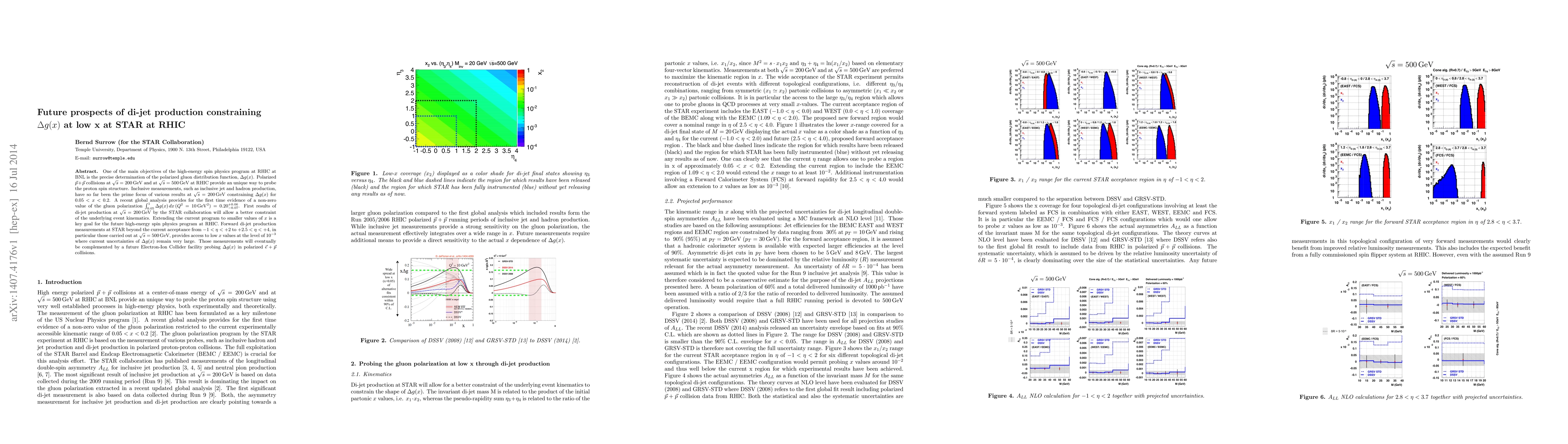 This paper discusses the future prospects of di-jet production measurements at STAR at RHIC to constrain the polarized gluon distribution function $\Delta g(x)$ at low $x$. The STAR collaboration's results at $\sqrt{s}=200\,$GeV and plans to extend measurements to lower $x$ values at $\sqrt{s}=500\,$GeV aim to reduce uncertainties in the gluon polarization.
