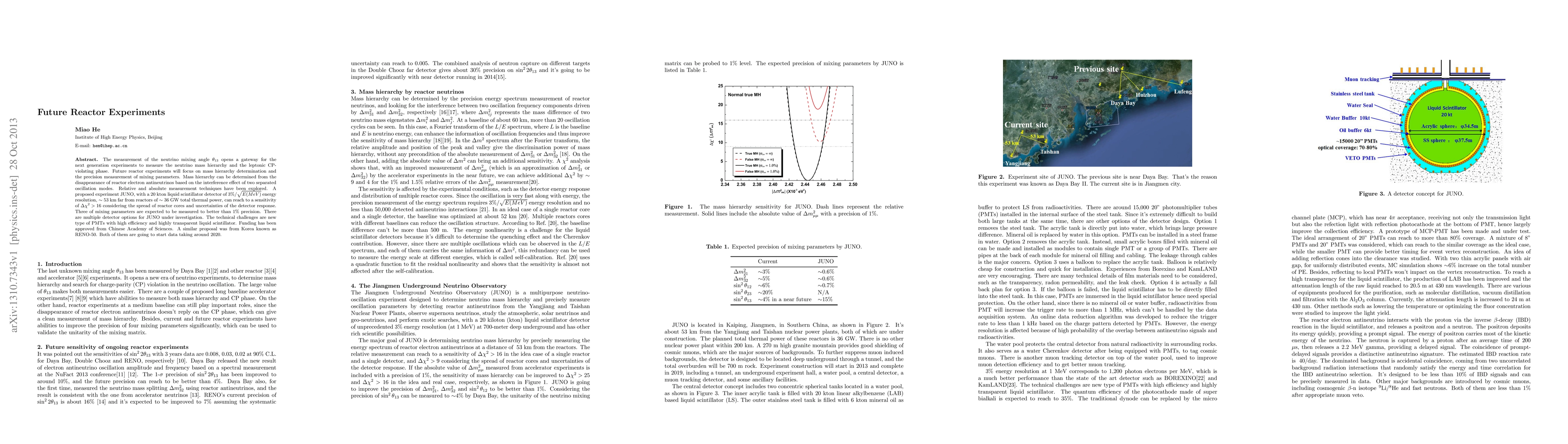 The paper discusses future reactor experiments aimed at measuring the neutrino mixing angle and mass hierarchy, focusing on the JUNO experiment with a 20 kton liquid scintillator detector. The proposed experiment aims to achieve high precision in determining the mass hierarchy and mixing parameters, with technical challenges including advanced PMTs and transparent liquid scintillator.