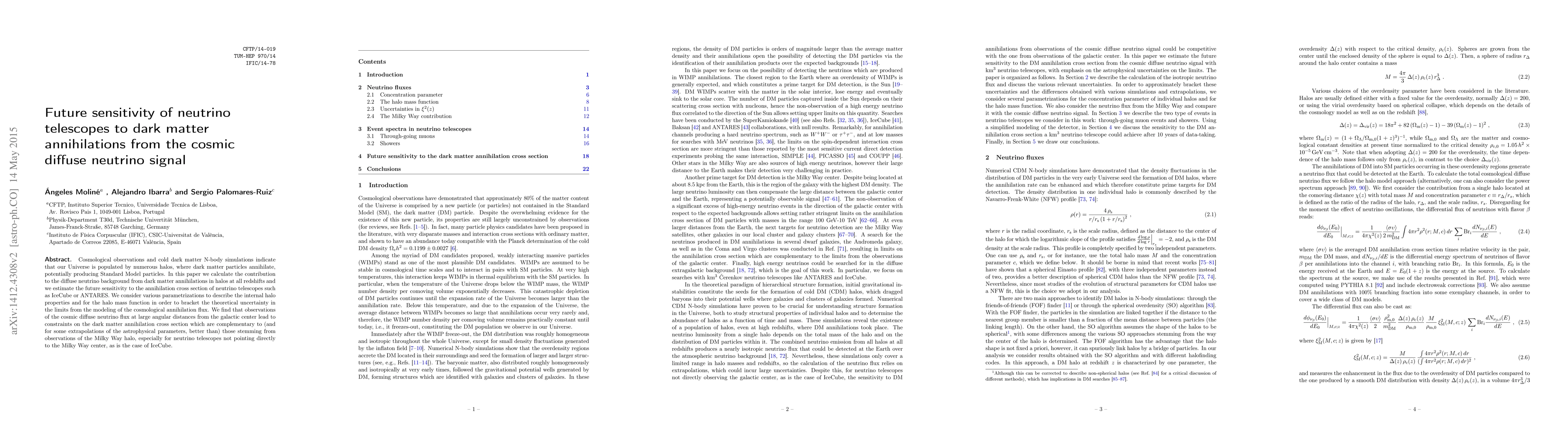 This paper calculates the contribution of dark matter annihilations in cosmic halos to the diffuse neutrino background and assesses the future sensitivity of neutrino telescopes like IceCube or ANTARES to these annihilations. It finds that observing the cosmic diffuse neutrino flux from large angular distances provides constraints on the dark matter annihilation cross section that are often superior to those from Milky Way observations, especially for telescopes like IceCube.