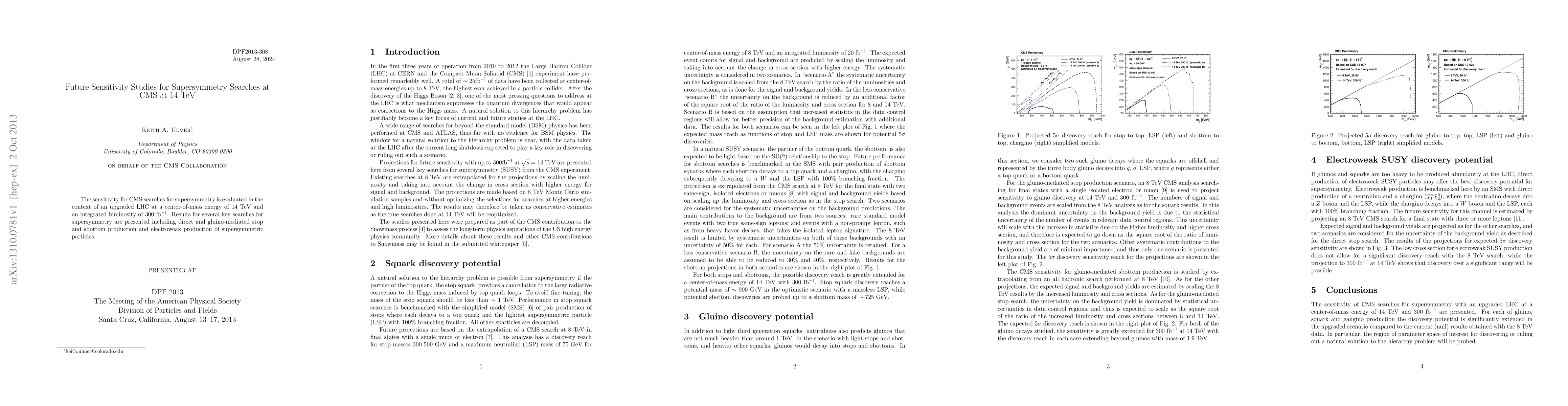 This paper evaluates the future sensitivity of CMS for supersymmetry searches at the upgraded LHC with 14 TeV energy and 300 fb^-1 luminosity, focusing on direct and gluino-mediated production of stop and sbottom, as well as electroweak production of supersymmetric particles.