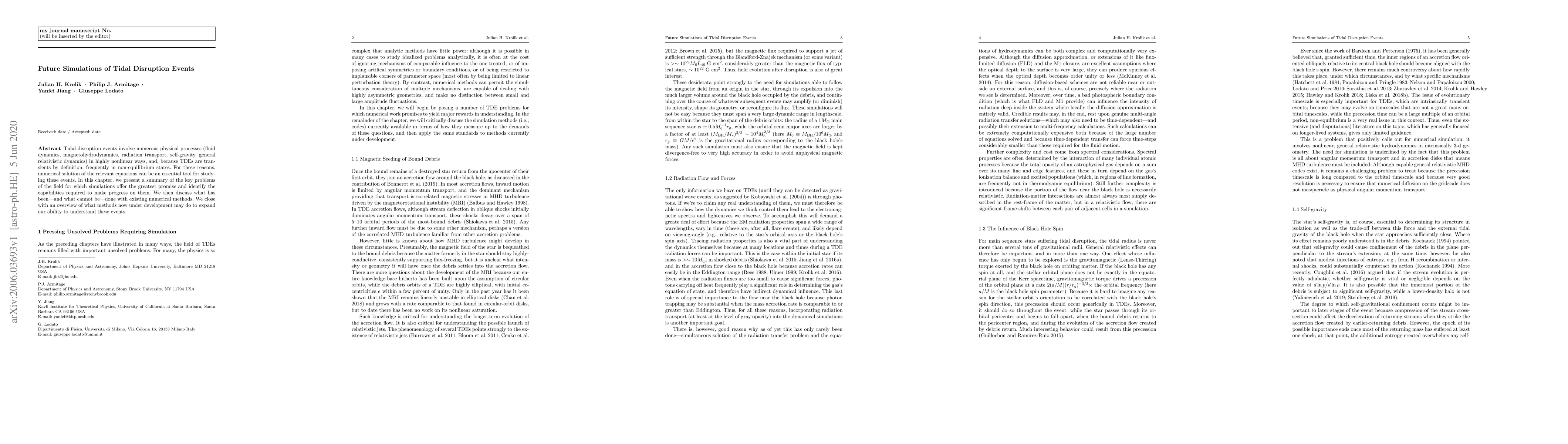 Tidal disruption events involve numerous physical processes (fluid dynamics, magnetohydrodynamics, radiation transport, self-gravity, general relativistic dynamics) in highly nonlinear ways, and, because TDEs are transients by definition, frequently in non-equilibrium states. For these reasons, numerical solution of the relevant equations can be an essential tool for studying these events. In this chapter, we present a summary of the key problems of the field for which simulations offer the greatest promise and identify the capabilities required to make progress on them. We then discuss what has been---and what cannot be---done with existing numerical methods. We close with an overview of what methods now under development may do to expand our ability to understand these events.