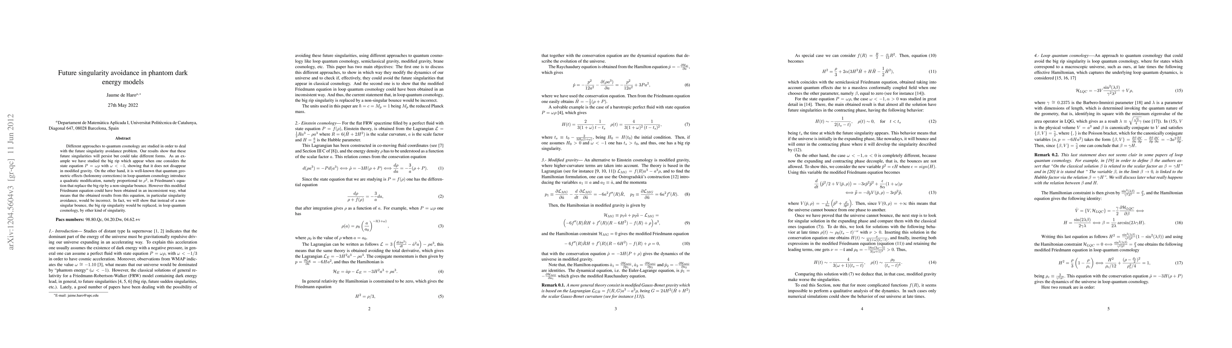 Different approaches to quantum cosmology are studied in order to deal with the future singularity avoidance problem. Our results show that these future singularities will persist but could take different forms. As an example we have studied the big rip which appear when one considers the state equation $P=\omega\rho$ with $\omega<-1$, showing that it does not disappear in modified gravity. On the other hand, it is well-known that quantum geometric effects (holonomy corrections) in loop quantum cosmology introduce a quadratic modification, namely proportional to $\rho^2$, in Friedmann's equation that replace the big rip by a non-singular bounce. However this modified Friedmann equation could have been obtained in an inconsistent way, what means that the obtained results from this equation, in particular singularity avoidance, would be incorrect. In fact, we will show that instead of a non-singular bounce, the big rip singularity would be replaced, in loop quantum cosmology, by other kind of singularity.