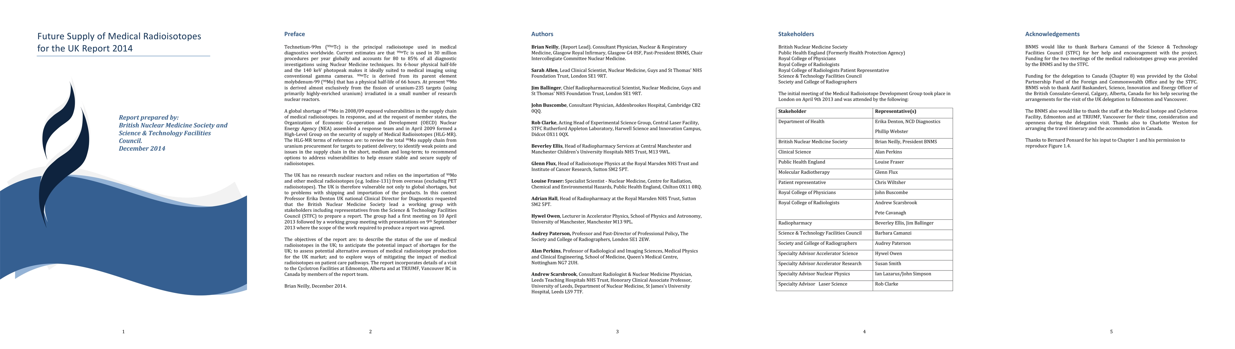 The UK has no research nuclear reactors and relies on the importation of 99Mo and other medical radioisotopes (e.g. Iodine-131) from overseas (excluding PET radioisotopes). The UK is therefore vulnerable not only to global shortages, but to problems with shipping and importation of the products. In this context Professor Erika Denton UK national Clinical Director for Diagnostics requested that the British Nuclear Medicine Society lead a working group with stakeholders including representatives from the Science & Technology Facilities Council (STFC) to prepare a report. The group had a first meeting on 10 April 2013 followed by a working group meeting with presentations on 9th September 2013 where the scope of the work required to produce a report was agreed. The objectives of the report are: to describe the status of the use of medical radioisotopes in the UK; to anticipate the potential impact of shortages for the UK; to assess potential alternative avenues of medical radioisotope production for the UK market; and to explore ways of mitigating the impact of medical radioisotopes on patient care pathways. The report incorporates details of a visit to the Cyclotron Facilities at Edmonton, Alberta and at TRIUMF, Vancouver BC in Canada by members of the report team.