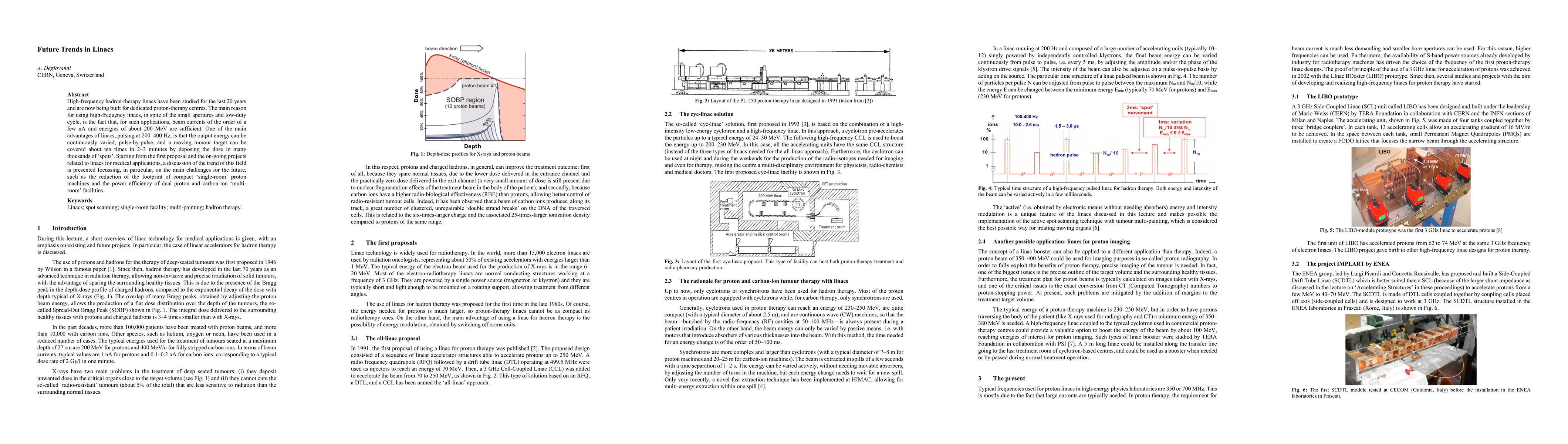 High-frequency hadron-therapy linacs have been studied for the last 20 years and are now being built for dedicated proton-therapy centres. The main reason for using high-frequency linacs, in spite of the small apertures and low-duty cycle, is the fact that, for such applications, beam currents of the order of a few nA and energies of about 200 MeV are sufficient. One of the main advantages of linacs, pulsing at 200-400Hz, is that the output energy can be continuously varied, pulse-by-pulse, and a moving tumour target can be covered about ten times in 2-3 minutes by deposing the dose in many thousands of 'spots'. Starting from the first proposal and the on-going projects related to linacs for medical applications, a discussion of the trend of this field is presented focussing, in particular, on the main challenges for the future, such as the reduction of the footprint of compact 'single-room' proton machines and the power efficiency of dual