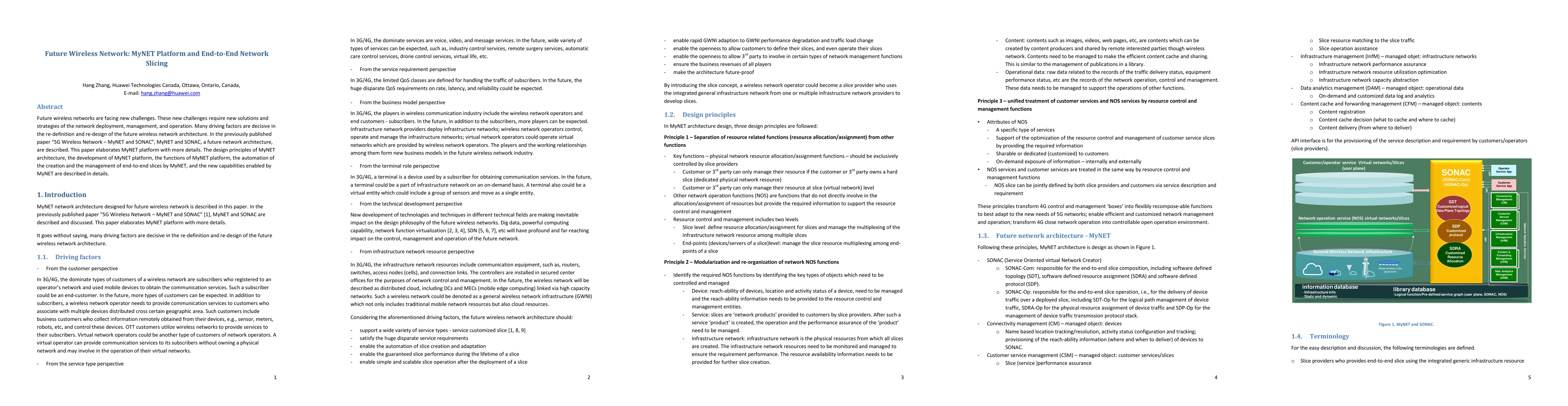 This paper provides an in-depth exploration of the MyNET platform, a future wireless network architecture designed to address new challenges in network deployment and management. It details the design principles, development, and capabilities of MyNET, particularly focusing on its automation for creating and managing end-to-end network slices.