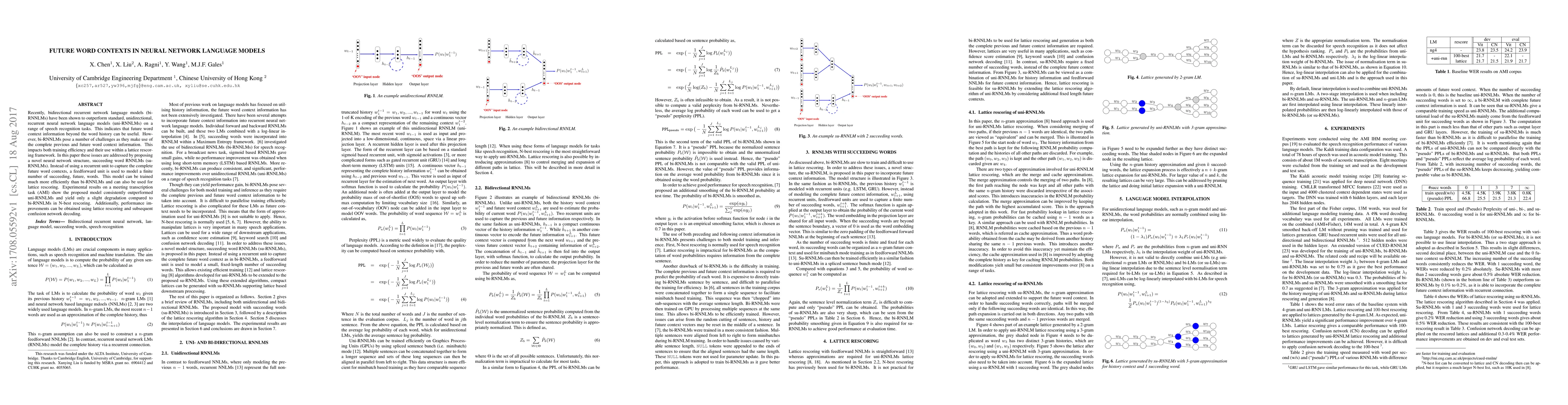 A new neural network structure called succeeding word RNNLMs (su-RNNLMs) is proposed to address challenges of bidirectional recurrent network language models in speech recognition tasks. The model outperforms standard uni-RNNLMs and achieves similar performance to bi-RNNLMs with lattice rescoring.
