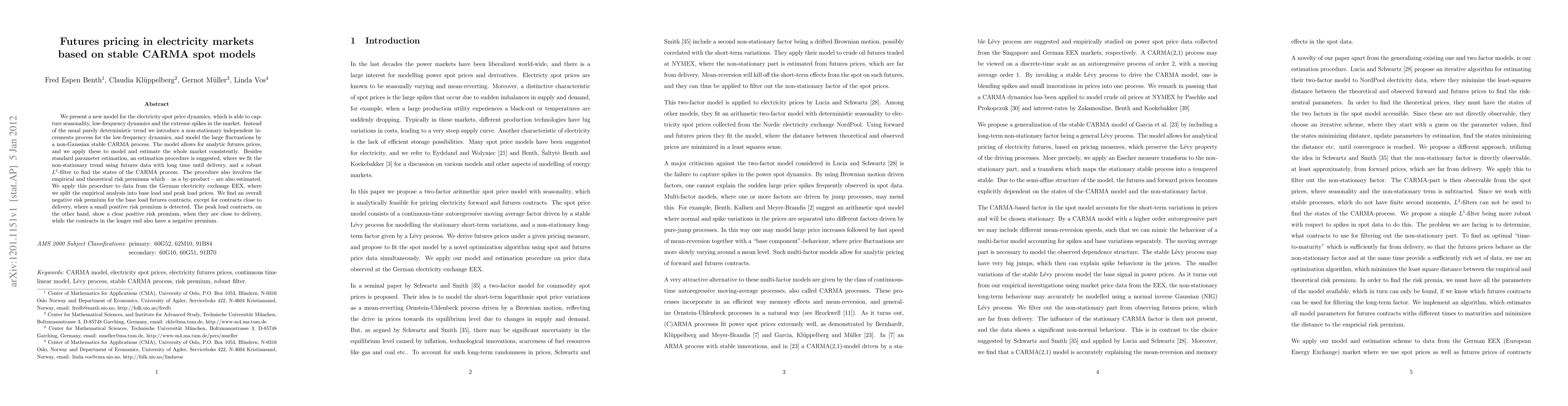 Researchers develop a new model for electricity spot prices that can capture seasonality and extreme fluctuations, leading to estimates of risk premiums in futures contracts, with negative premiums found in base load contracts except near delivery, and positive premiums in peak load contracts near delivery.