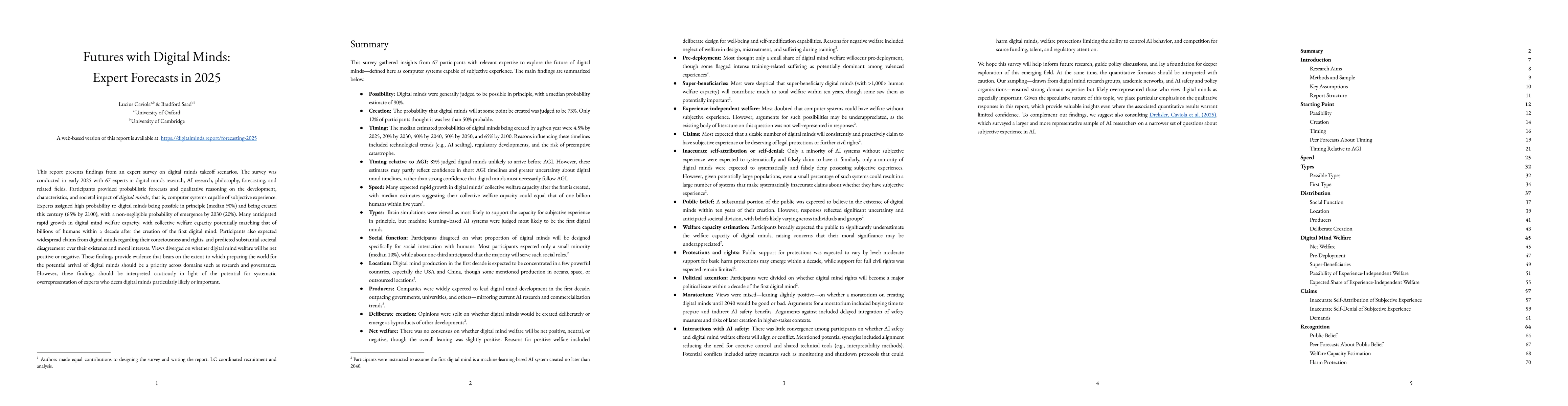 This report presents findings from an expert survey on digital minds takeoff scenarios. The survey was conducted in early 2025 with 67 experts in digital minds research, AI research, philosophy, forecasting, and related fields. Participants provided probabilistic forecasts and qualitative reasoning on the development, characteristics, and societal impact of digital minds, that is, computer systems capable of subjective experience. Experts assigned high probability to digital minds being possible in principle (median 90%) and being created this century (65% by 2100), with a non-negligible probability of emergence by 2030 (20%). Many anticipated rapid growth in digital mind welfare capacity, with collective welfare capacity potentially matching that of billions of humans within a decade after the creation of the first digital mind. Participants also expected widespread claims from digital minds regarding their consciousness and rights, and predicted substantial societal disagreement over their existence and moral interests. Views diverged on whether digital mind welfare will be net positive or negative. These findings provide evidence that bears on the extent to which preparing the world for the potential arrival of digital minds should be a priority across domains such as research and governance. However, these findings should be interpreted cautiously in light of the potential for systematic overrepresentation of experts who deem digital minds particularly likely or important.