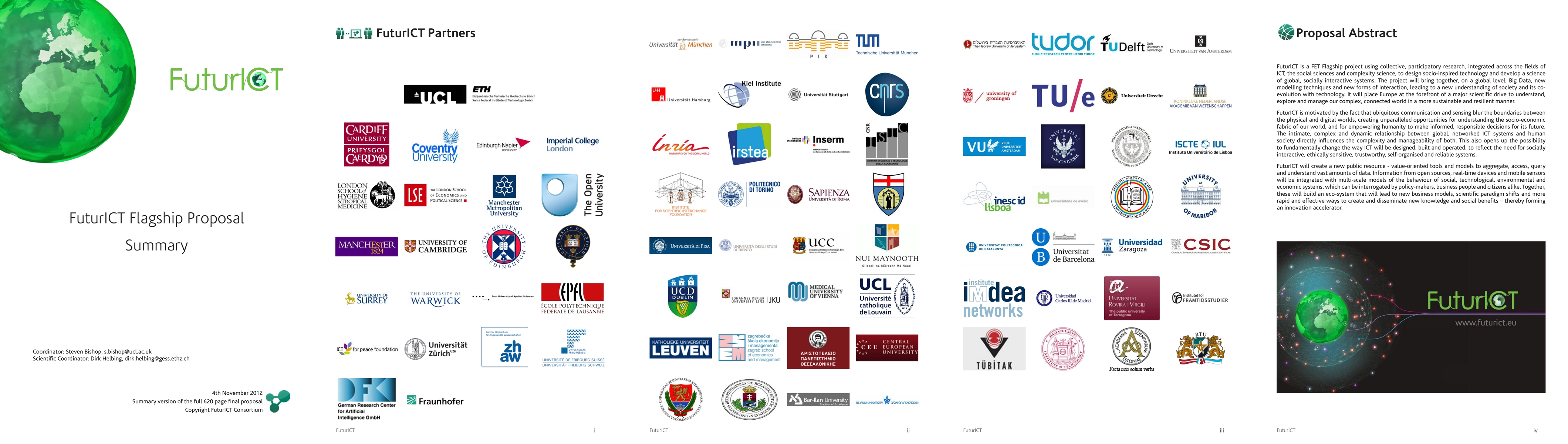 FuturlCT is a FET Flagship project using collective, participatory research, integrated across ICT, the social sciences and complexity science, to design socio-inspired technology and develop a science of global, socially interactive systems. The project will bring together, on a global level, Big Data, new modelling techniques and new forms of interaction, leading to a new understanding of society and its coevolution with technology. It aims to understand, explore and manage our complex, connected world in a more sustainable and resilient way. FuturICT is motivated by the fact that ubiquitous communication and sensing blur the boundaries between the physical and digital worlds, creating unparalleled opportunities for understanding the socio-economic fabric of our world, and for empowering humanity to make informed, responsible decisions for its future. The intimate, complex and dynamic relationship between global, networked ICT systems and human society directly influences the complexity and manageability of both. This also opens up the possibility to fundamentally change the way ICT will be designed, built and operated, to reflect the need for socially interactive, ethically sensitive, trustworthy, self-organised and reliable systems. FuturICT will create a new public resource - value-oriented tools and models to aggregate, access, query and understand vast amounts of data. Information from open sources, real-time devices and mobile sensors will be integrated with multi-scale models of the behaviour of social, technological, environmental and economic systems, which can be interrogated by policy-makers, business people and citizens alike. Together, these will build an eco-system that will lead to new business models, scientific paradigm shifts and more rapid and effective ways to create and disseminate new knowledge and social benefits - thereby forming an innovation accelerator.