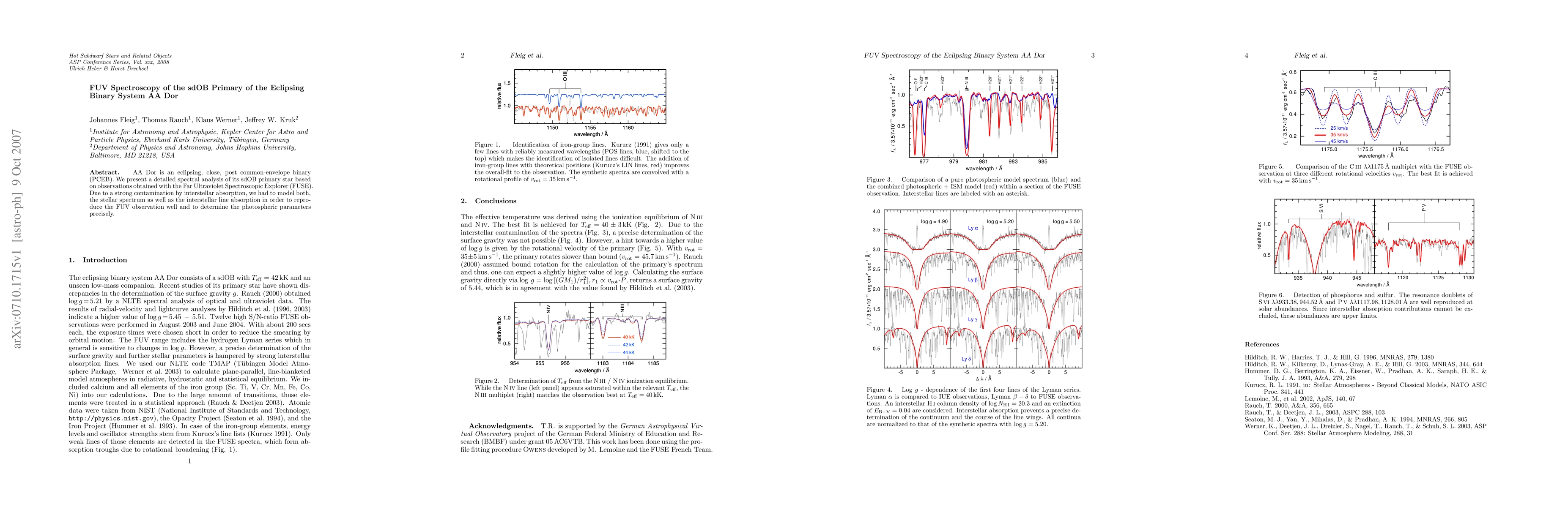 This paper presents a detailed spectral analysis of the sdOB primary star in the eclipsing binary system AA Dor, using FUSE observations. The study accounts for strong interstellar absorption, modeling both the stellar spectrum and the interstellar line absorption to accurately determine the photospheric parameters.