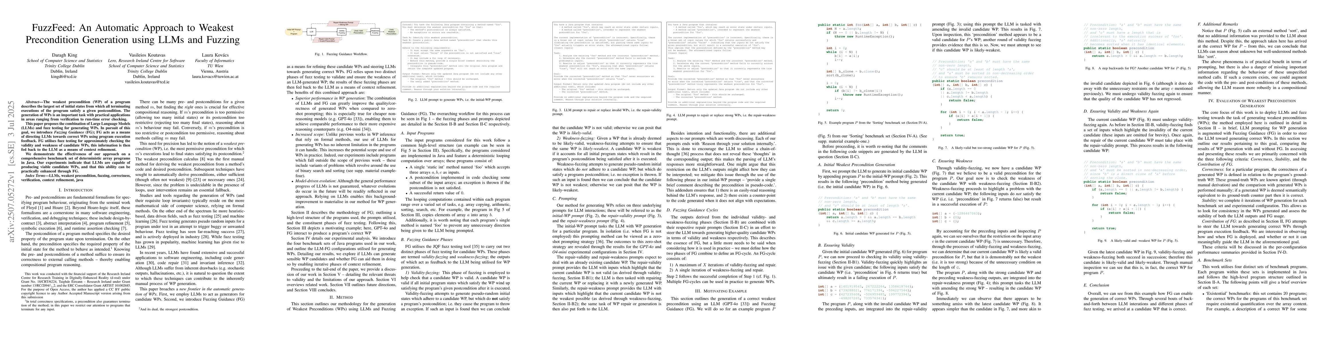 The weakest precondition (WP) of a program describes the largest set of initial states from which all terminating executions of the program satisfy a given postcondition. The generation of WPs is an important task with practical applications in areas ranging from verification to run-time error checking. This paper proposes the combination of Large Language Models (LLMs) and fuzz testing for generating WPs. In pursuit of this goal, we introduce Fuzzing Guidance (FG); FG acts as a means of directing LLMs towards correct WPs using program execution feedback. FG utilises fuzz testing for approximately checking the validity and weakness of candidate WPs, this information is then fed back to the LLM as a means of context refinement. We demonstrate the effectiveness of our approach on a comprehensive benchmark set of deterministic array programs in Java. Our experiments indicate that LLMs are capable of producing viable candidate WPs, and that this ability can be practically enhanced through FG.