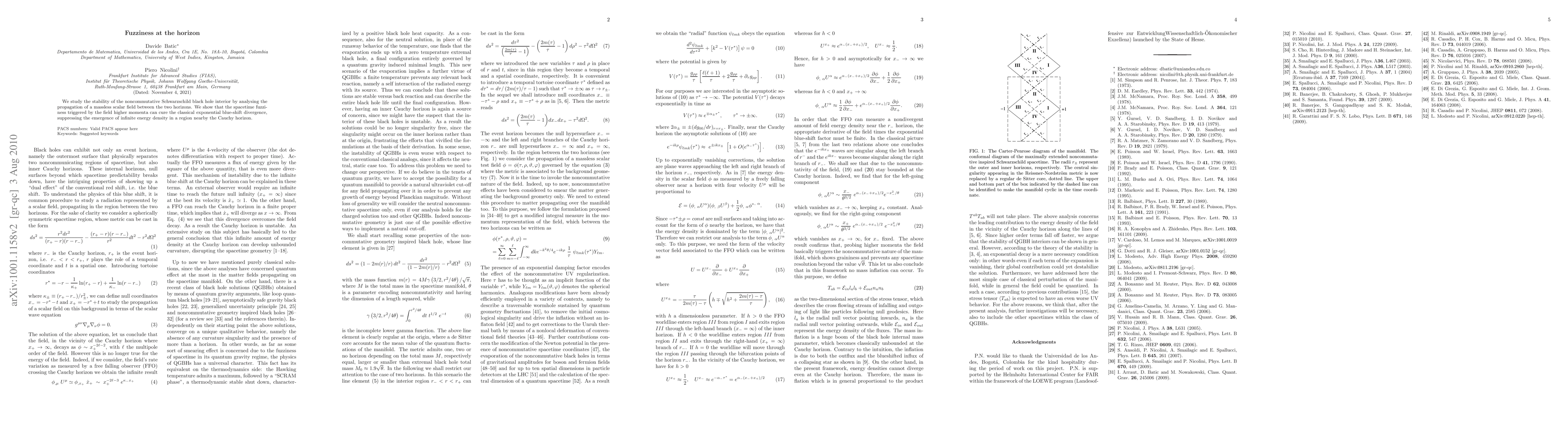 We study the stability of the noncommutative Schwarzschild black hole interior by analysing the propagation of a massless scalar field between the two horizons. We show that the spacetime fuzziness triggered by the field higher momenta can cure the classical exponential blue shift divergence, suppressing the emergence of infinite energy density in a region nearby the Cauchy horizon.