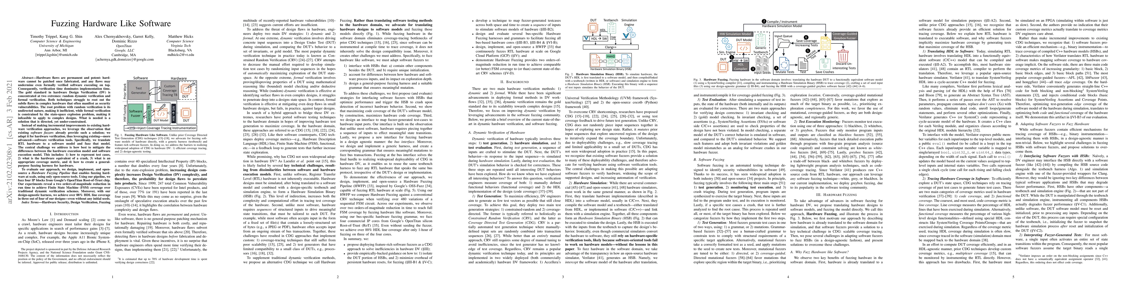 This paper proposes adapting software fuzzers for hardware design verification to efficiently uncover subtle flaws. By translating RTL hardware to a software model and fuzzing it, the authors achieve significant reductions in verification time and high coverage rates, demonstrating the effectiveness of this approach through experiments on Google's OpenTitan SoC IP blocks.