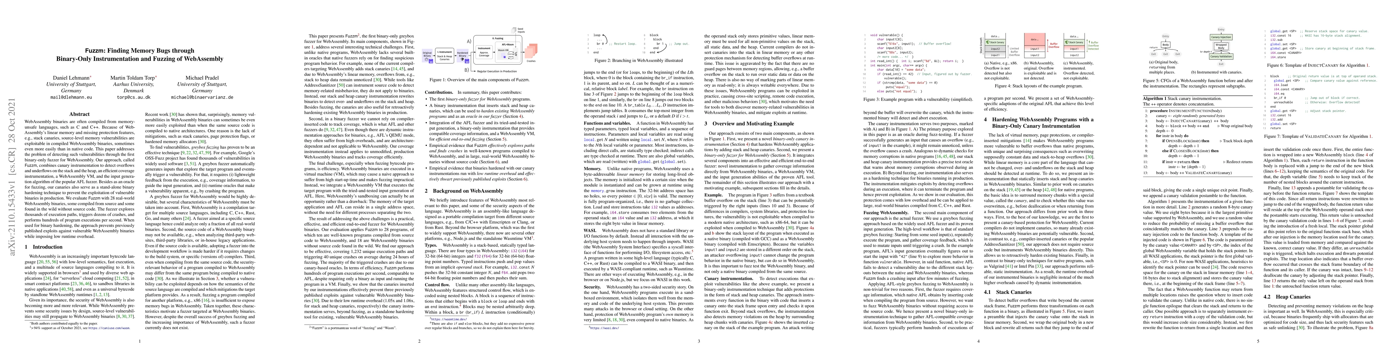 Fuzzm is a novel binary-only fuzzer designed to detect memory vulnerabilities in WebAssembly binaries, combining canary instrumentation, coverage instrumentation, and AFL's input generation. It effectively prevents exploitation of vulnerabilities and imposes minimal runtime overhead.