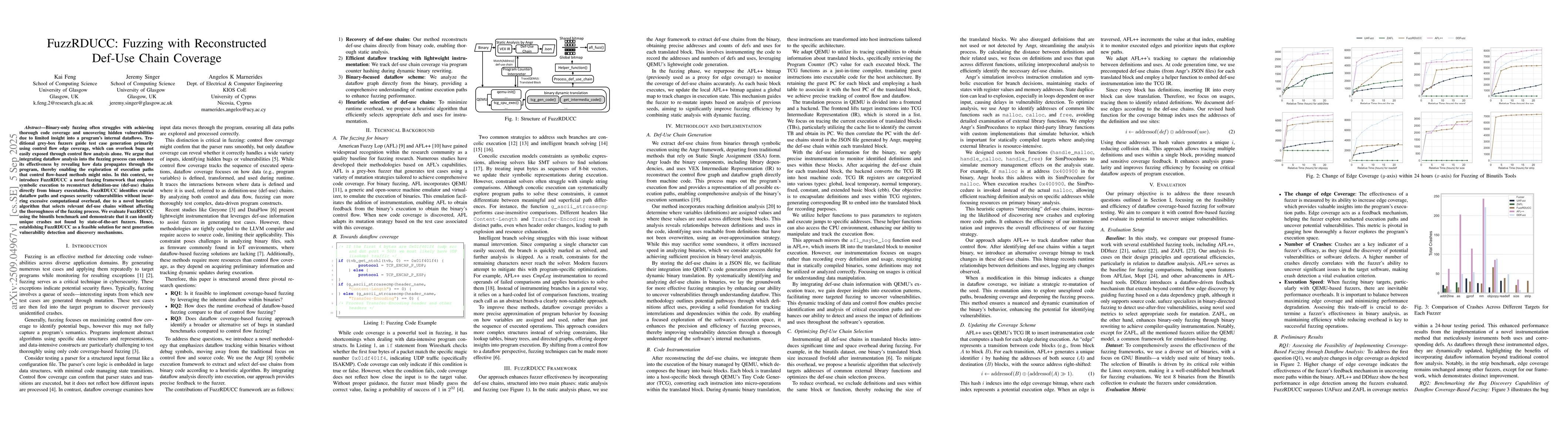 Binary-only fuzzing often struggles with achieving thorough code coverage and uncovering hidden vulnerabilities due to limited insight into a program's internal dataflows. Traditional grey-box fuzzers guide test case generation primarily using control flow edge coverage, which can overlook bugs not easily exposed through control flow analysis alone. We argue that integrating dataflow analysis into the fuzzing process can enhance its effectiveness by revealing how data propagates through the program, thereby enabling the exploration of execution paths that control flow-based methods might miss. In this context, we introduce FuzzRDUCC, a novel fuzzing framework that employs symbolic execution to reconstruct definition-use (def-use) chains directly from binary executables. FuzzRDUCC identifies crucial dataflow paths and exposes security vulnerabilities without incurring excessive computational overhead, due to a novel heuristic algorithm that selects relevant def-use chains without affecting the thoroughness of the fuzzing process. We evaluate FuzzRDUCC using the binutils benchmark and demonstrate that it can identify unique crashes not found by state-of-the-art fuzzers. Hence, establishing FuzzRDUCC as a feasible solution for next generation vulnerability detection and discovery mechanisms.
