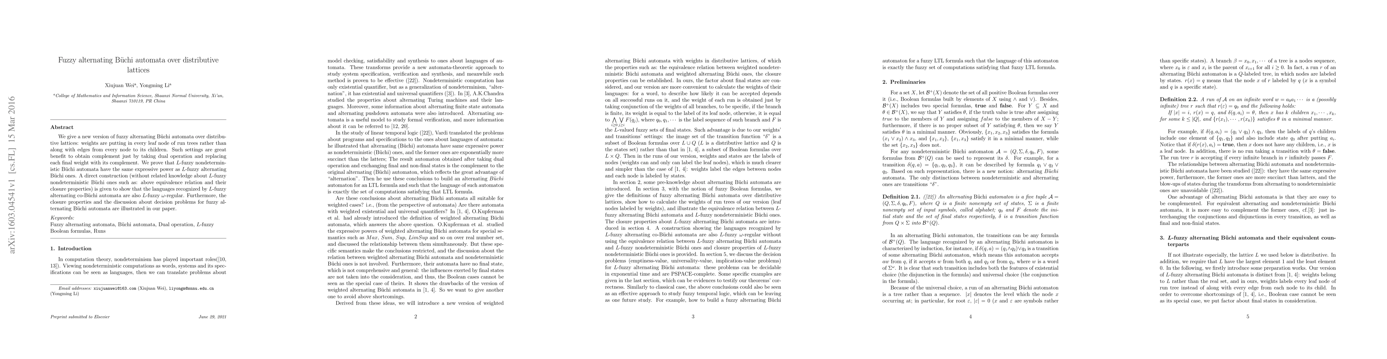 We give a new version of fuzzy alternating $\mathrm{B\ddot{u}chi}$ automata over distributive lattices: weights are putting in every leaf node of run trees rather than along with edges from every node to its children. Such settings are great benefit to obtain complement just by taking dual operation and replacing each final weight with its complement. We prove that $L$-fuzzy nondeterministic $\mathrm{B\ddot{u}chi}$ automata have the same expressive power as $L$-fuzzy alternating $\mathrm{B\ddot{u}chi}$ ones. A direct construction (without related knowledge about $L$-fuzzy nondeterministic $\mathrm{B\ddot{u}chi}$ ones such as: above equivalence relation and their closure properties) is given to show that the languages recognized by $L$-fuzzy alternating co-$\mathrm{B\ddot{u}chi}$ automata are also $L$-fuzzy $\omega$-regular. Furthermore, the closure properties and the discussion about decision problems for fuzzy alternating $\mathrm{B\ddot{u}chi}$ automata are illustrated in our paper.