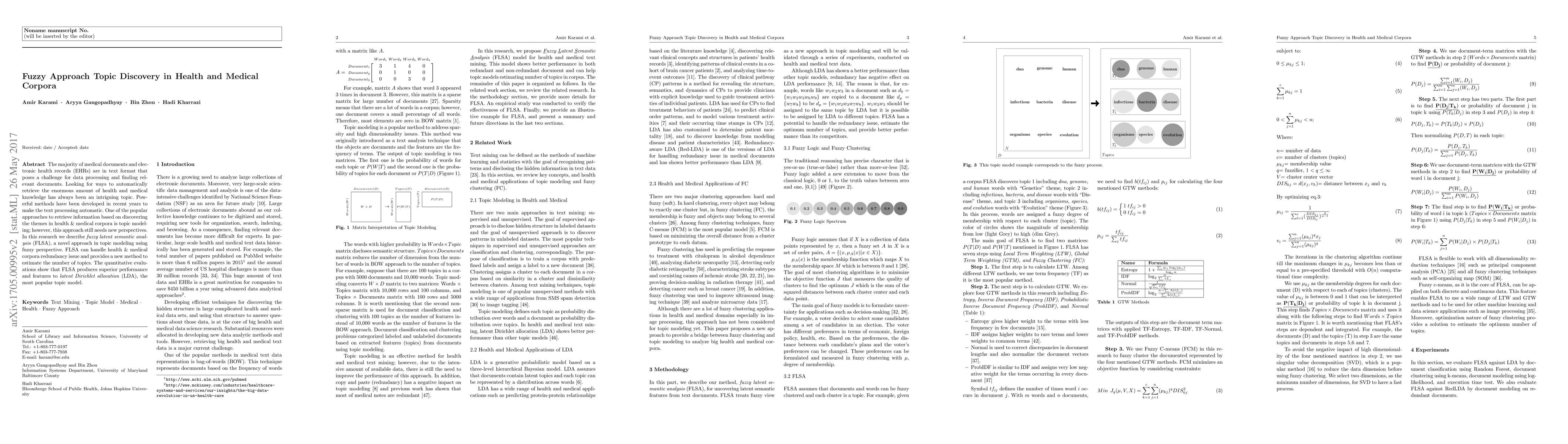 This paper introduces a novel fuzzy latent semantic analysis (FLSA) approach for topic modeling in health and medical corpora, addressing redundancy and offering a new method for estimating the number of topics. FLSA outperforms latent Dirichlet allocation (LDA) in quantitative evaluations.