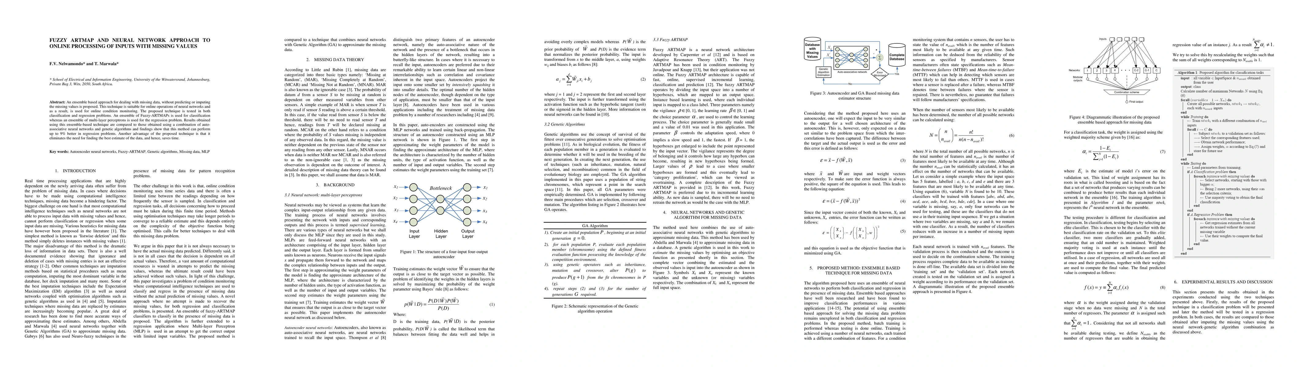 An ensemble based approach for dealing with missing data, without predicting or imputing the missing values is proposed. This technique is suitable for online operations of neural networks and as a result, is used for online condition monitoring. The proposed technique is tested in both classification and regression problems. An ensemble of Fuzzy-ARTMAPs is used for classification whereas an ensemble of multi-layer perceptrons is used for the regression problem. Results obtained using this ensemble-based technique are compared to those obtained using a combination of auto-associative neural networks and genetic algorithms and findings show that this method can perform up to 9% better in regression problems. Another advantage of the proposed technique is that it eliminates the need for finding the best estimate of the data, and hence, saves time.