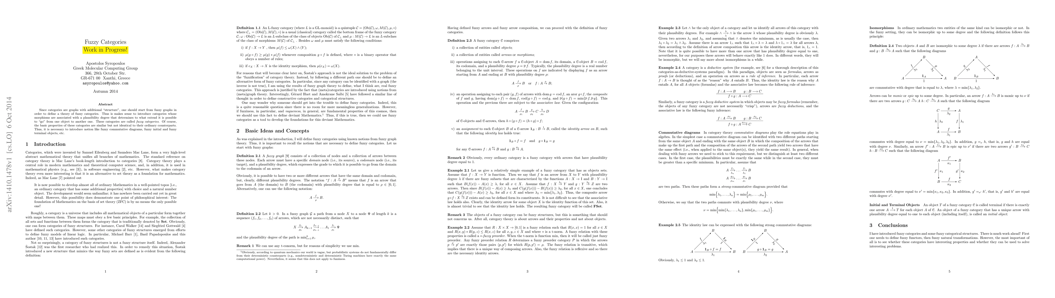 Since categories are graphs with additional "structure", one should start from fuzzy graphs in order to define a theory of fuzzy categories. Thus is makes sense to introduce categories whose morphisms are associated with a plausibility degree that determines to what extend it is possible to "go" from one object to another one. These categories are called {\em fuzzy categories}. Of course, the basic properties of these categories are similar but not identical to their ordinary counterparts. Thus, it is necessary to introduce notion like fuzzy commutative diagrams, fuzzy initial and fuzzy terminal objects, etc.