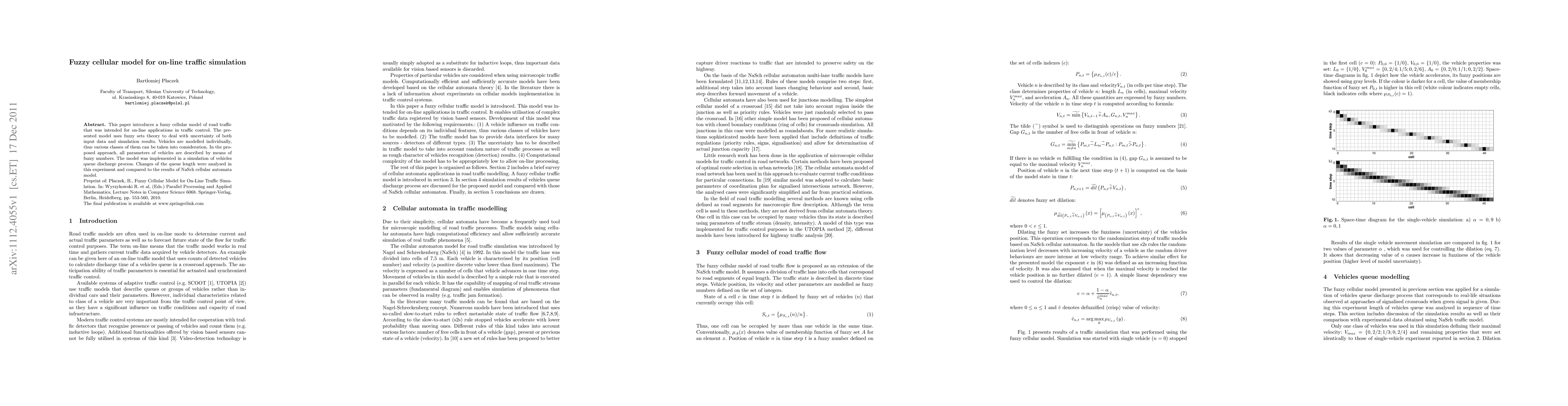This paper presents a fuzzy cellular model for on-line traffic simulation that uses fuzzy sets to handle uncertainties in input data and simulation results, allowing for individual vehicle modeling and comparison with the NaSch cellular automata model. The model was tested on a vehicle queue discharge process, analyzing queue length changes.