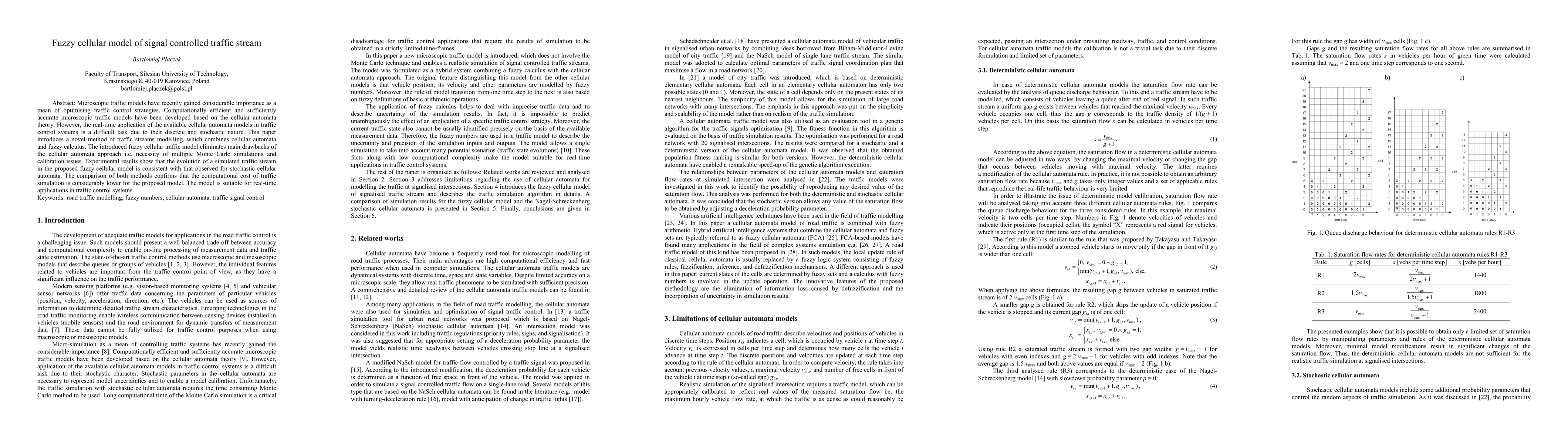 Microscopic traffic models have recently gained considerable importance as a mean of optimising traffic control strategies. Computationally efficient and sufficiently accurate microscopic traffic models have been developed based on the cellular automata theory. However, the real-time application of the available cellular automata models in traffic control systems is a difficult task due to their discrete and stochastic nature. This paper introduces a novel method of traffic streams modelling, which combines cellular automata and fuzzy calculus. The introduced fuzzy cellular traffic model eliminates main drawbacks of the cellular automata approach i.e. necessity of multiple Monte Carlo simulations and calibration issues. Experimental results show that the evolution of a simulated traffic stream in the proposed fuzzy cellular model is consistent with that observed for stochastic cellular automata. The comparison of both methods confirms that the computational cost of traffic simulation is considerably lower for the proposed model. The model is suitable for real-time applications in traffic control systems.
