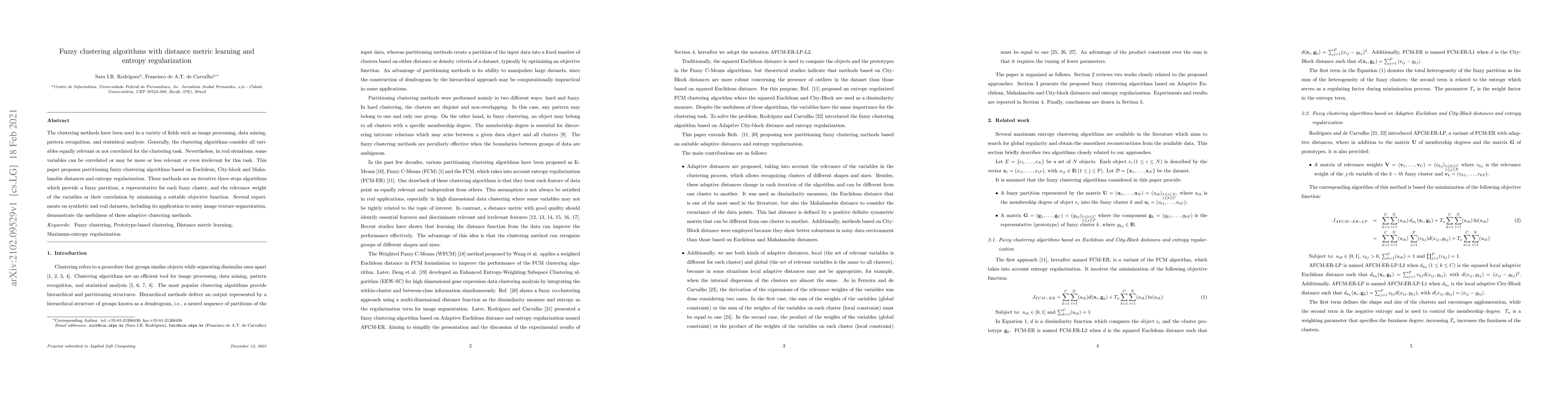 This paper proposes a new approach to fuzzy clustering algorithms that adaptively considers variable relevance through distance metric learning and entropy regularization, improving performance on real-world datasets.