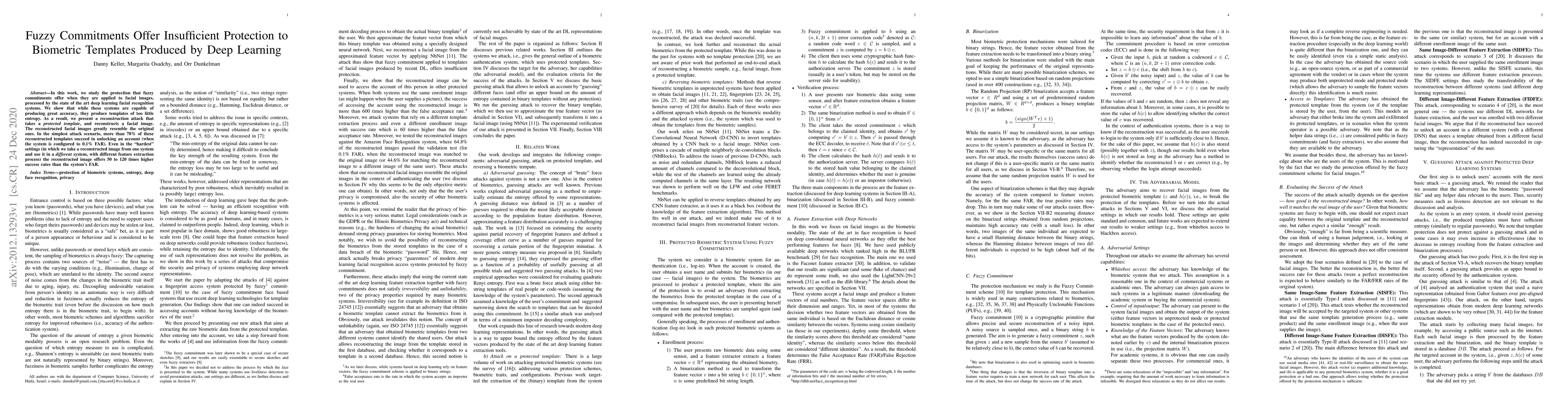 In this work, we study the protection that fuzzy commitments offer when they are applied to facial images, processed by the state of the art deep learning facial recognition systems. We show that while these systems are capable of producing great accuracy, they produce templates of too little entropy. As a result, we present a reconstruction attack that takes a protected template, and reconstructs a facial image. The reconstructed facial images greatly resemble the original ones. In the simplest attack scenario, more than 78% of these reconstructed templates succeed in unlocking an account (when the system is configured to 0.1% FAR). Even in the "hardest" settings (in which we take a reconstructed image from one system and use it in a different system, with different feature extraction process) the reconstructed image offers 50 to 120 times higher success rates than the system's FAR.