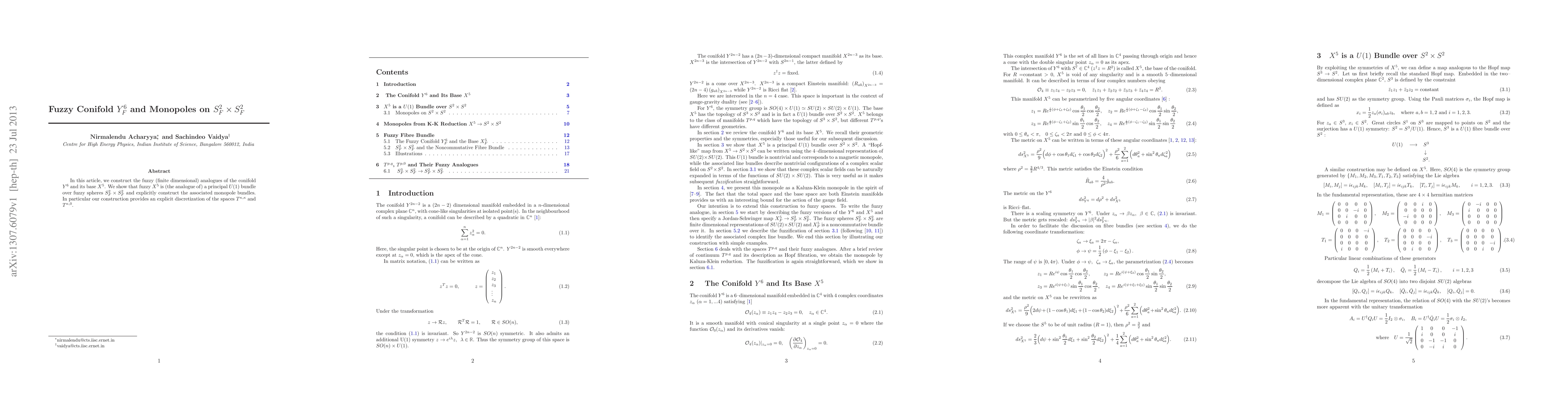 In this article, we construct the fuzzy (finite dimensional) analogues of the conifold $Y^6$ and its base $X^5$. We show that fuzzy $X^5$ is (the analogue of) a principal U(1) bundle over fuzzy spheres $S^2_F \times S^2_F$ and explicitly construct the associated monopole bundles. In particular our construction provides an explicit discretization of the spaces $T^{\kappa,\kappa}$ and $T^{\kappa,0}$.