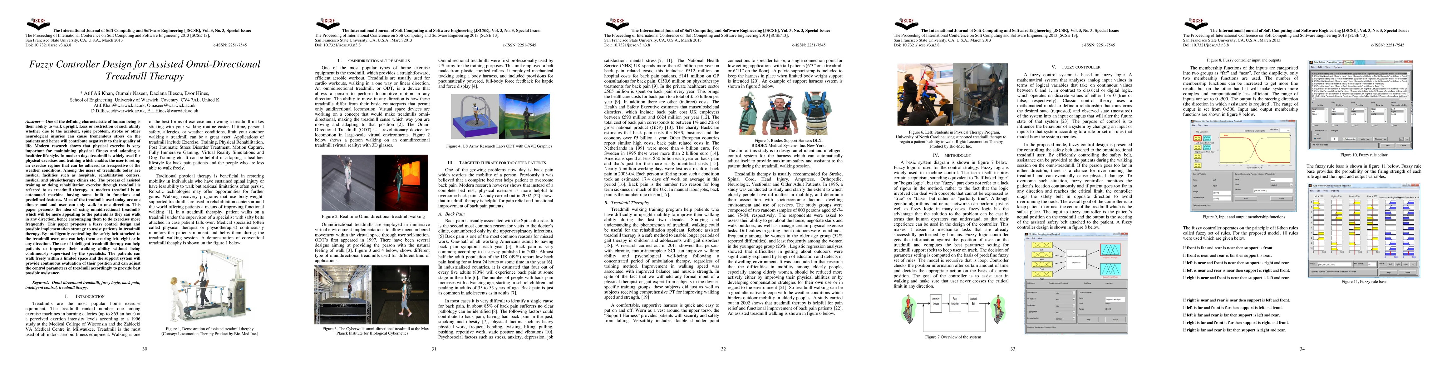 One of the defining characteristic of human being is their ability to walk upright. Loss or restriction of such ability whether due to the accident, spine problem, stroke or other neurological injuries can cause tremendous stress on the patients and hence will contribute negatively to their quality of life. Modern research shows that physical exercise is very important for maintaining physical fitness and adopting a healthier life style. In modern days treadmill is widely used for physical exercises and training which enables the user to set up an exercise regime that can be adhered to irrespective of the weather conditions. Among the users of treadmills today are medical facilities such as hospitals, rehabilitation centres, medical and physiotherapy clinics etc. The process of assisted training or doing rehabilitation exercise through treadmill is referred to as treadmill therapy. A modern treadmill is an automated machine having built in functions and predefined features. Most of the treadmills used today are one dimensional and user can only walk in one direction. This paper presents the idea of using omnidirectional treadmills which will be more appealing to the patients as they can walk in any direction, hence encouraging them to do exercises more frequently. This paper proposes a fuzzy control design and possible implementation strategy to assist patients in treadmill therapy. By intelligently controlling the safety belt attached to the treadmill user, one can help them steering left, right or in any direction. The use of intelligent treadmill therapy can help patients to improve their walking ability without being continuously supervised by the specialists. The patients can walk freely within a limited space and the support system will provide continuous evaluation of their position and can adjust the control parameters of treadmill accordingly to provide best possible assistance.