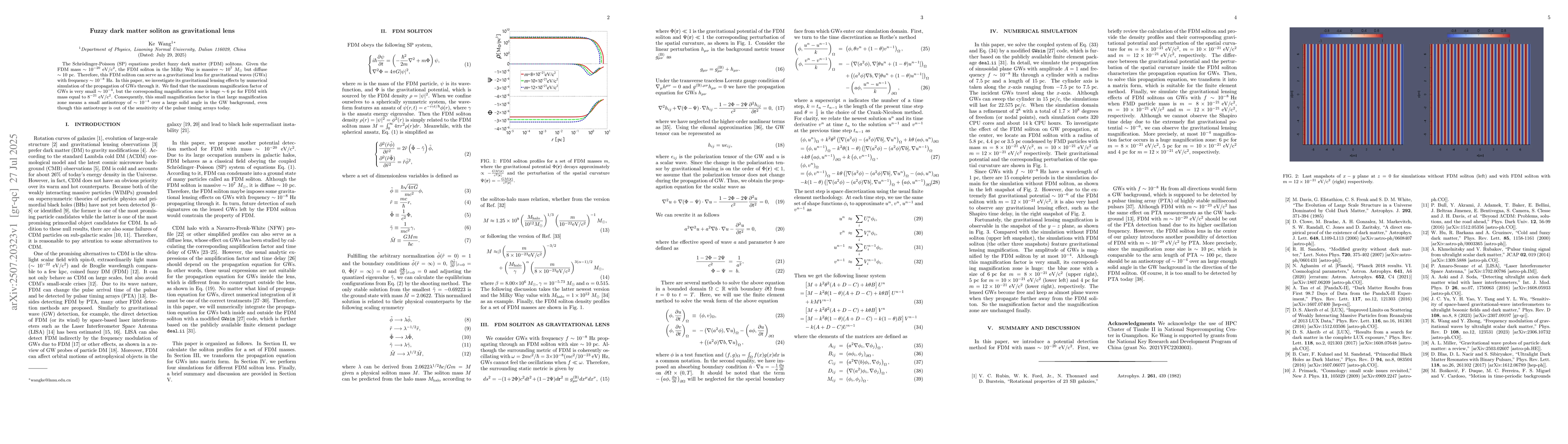 The Schr\"odinger-Poisson (SP) equations predict fuzzy dark matter (FDM) solitons. Given the FDM mass $\sim10^{-20}\rm~{eV}/c^2$, the FDM soliton in the Milky Way is massive $\sim 10^7~M_{\odot}$ but diffuse $\sim 10{\rm~pc}$. Therefore, this FDM soliton can serve as a gravitational lens for gravitational waves (GWs) with frequency $\sim10^{-8}{\rm~Hz}$. In this paper, we investigate its gravitational lensing effects by numerical simulation of the propagation of GWs through it. We find that the maximum magnification factor of GWs is very small $\sim10^{-4}$, but the corresponding magnification zone is huge $\sim6{\rm~pc}$ for FDM with mass equal to $8^{-21}\rm~{eV}/c^2$. Consequently, this small magnification factor in that large magnification zone means a small antisotropy of $\sim10^{-4}$ over a large solid angle in the GW background, even though this antisotropy is out of the sensitivity of the pulsar timing arrays today.