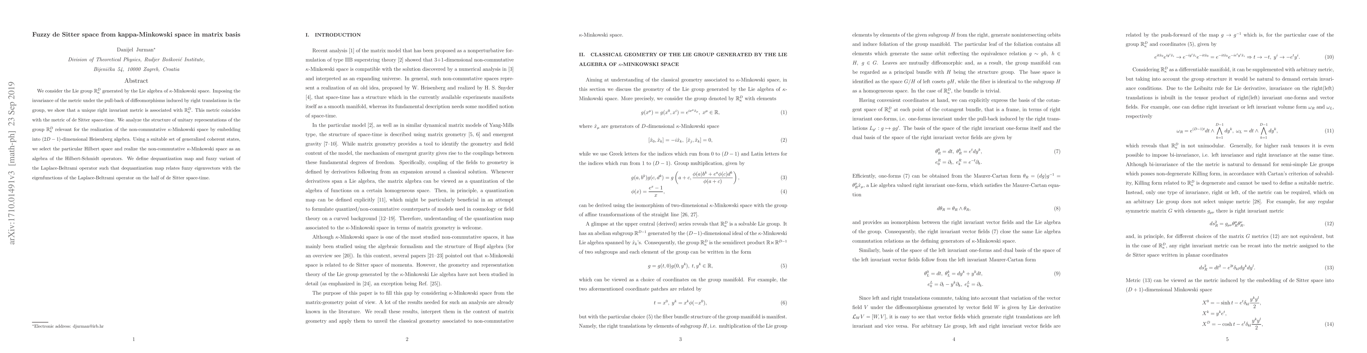 This paper explores the construction of fuzzy de Sitter space from $\kappa$-Minkowski space, showing that the metric of $\mathbb{R}^D_\kappa$ corresponds to that of de Sitter space. It uses generalized coherent states to realize the non-commutative $\kappa$-Minkowski space and defines a dequantization map relating fuzzy eigenvectors to eigenfunctions of the Laplace-Beltrami operator.