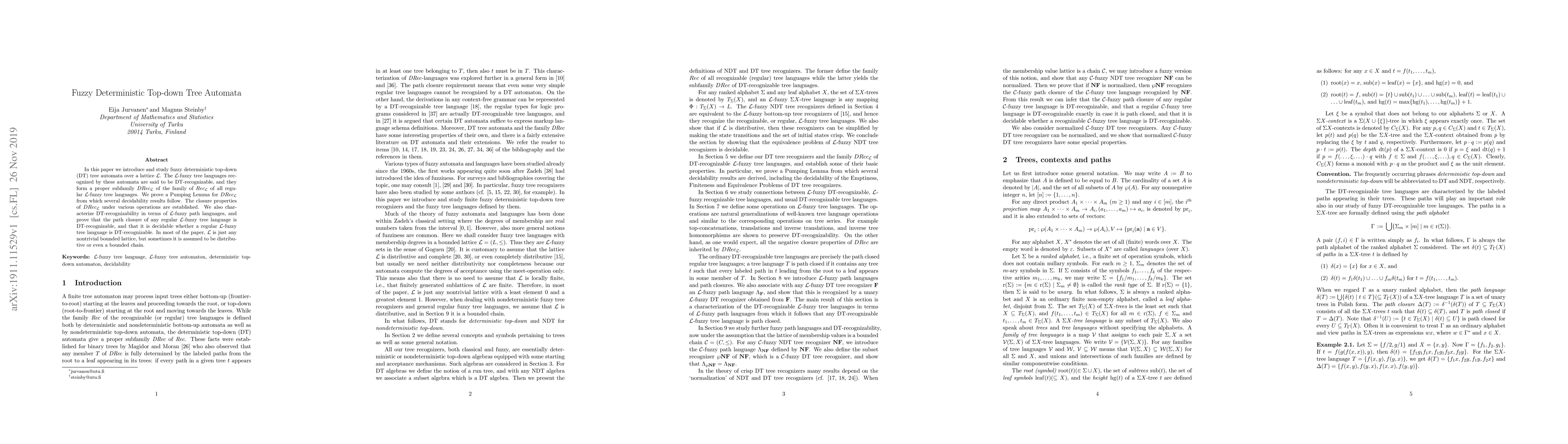 This paper introduces fuzzy deterministic top-down tree automata over lattices, proving a Pumping Lemma and establishing decidability and closure properties for the recognized L-fuzzy tree languages, denoted as $DRec_L$, which form a proper subfamily of all regular L-fuzzy tree languages.