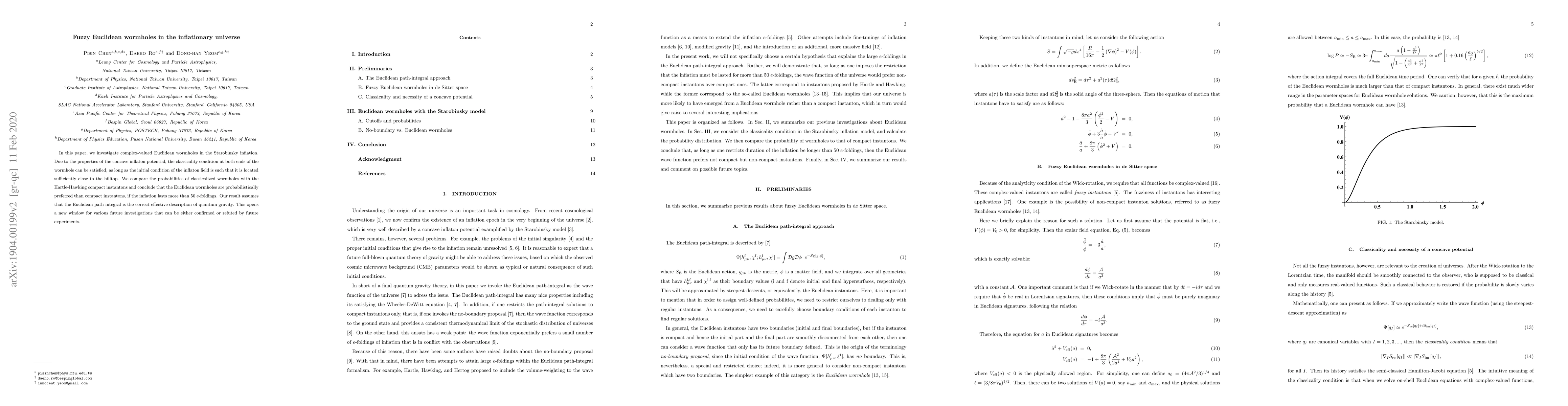 In this paper, we investigate complex-valued Euclidean wormholes in the Starobinsky inflation. Due to the properties of the concave inflaton potential, the classicality condition at both ends of the wormhole can be satisfied, as long as the initial condition of the inflaton field is such that it is located sufficiently close to the hilltop. We compare the probabilities of classicalized wormholes with the Hartle-Hawking compact instantons and conclude that the Euclidean wormholes are probabilistically preferred than compact instantons, if the inflation lasts more than 50 e-foldings. Our result assumes that the Euclidean path integral is the correct effective description of quantum gravity. This opens a new window for various future investigations that can be either confirmed or refuted by future experiments.