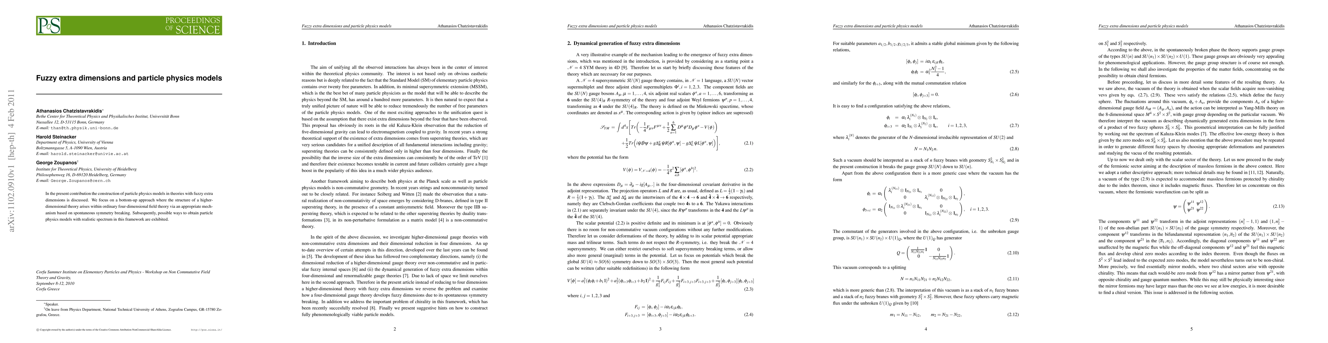 This paper explores particle physics models in theories with fuzzy extra dimensions, employing a bottom-up approach where higher-dimensional structures emerge from four-dimensional field theory through spontaneous symmetry breaking, and presents methods to achieve realistic particle spectra.