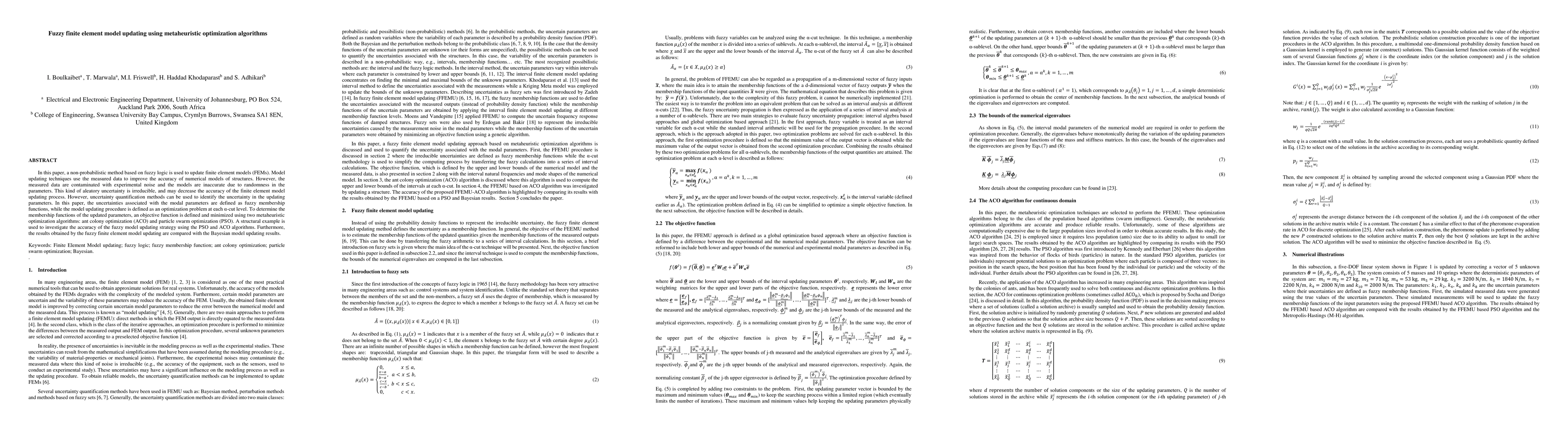 This paper proposes a fuzzy logic-based method for updating finite element models using metaheuristic optimization algorithms, specifically ant colony optimization and particle swarm optimization, to handle uncertainties in measured data and model parameters. The results are compared with Bayesian model updating to assess accuracy.