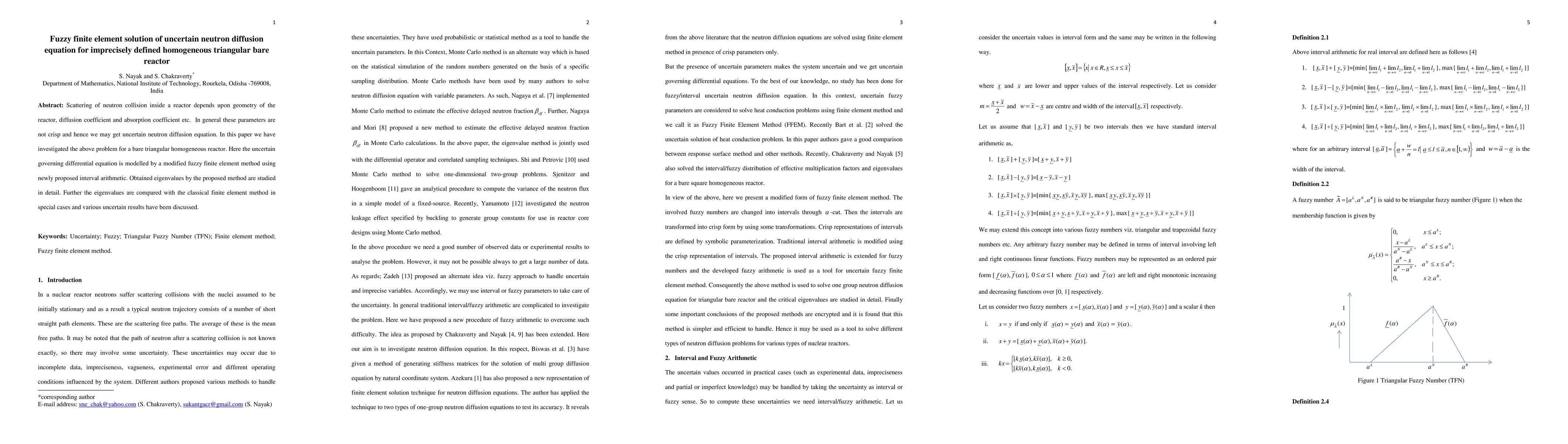 Scattering of neutron collision inside a reactor depends upon geometry of the reactor, diffusion coefficient and absorption coefficient etc. In general these parameters are not crisp and hence we may get uncertain neutron diffusion equation. In this paper we have investigated the above problem for a bare triangular homogeneous reactor. Here the uncertain governing differential equation is modelled by a modified fuzzy finite element method using newly proposed interval arithmetic. Obtained eigenvalues by the proposed method are studied in detail. Further the eigenvalues are compared with the classical finite element method in special cases and various uncertain results have been discussed.