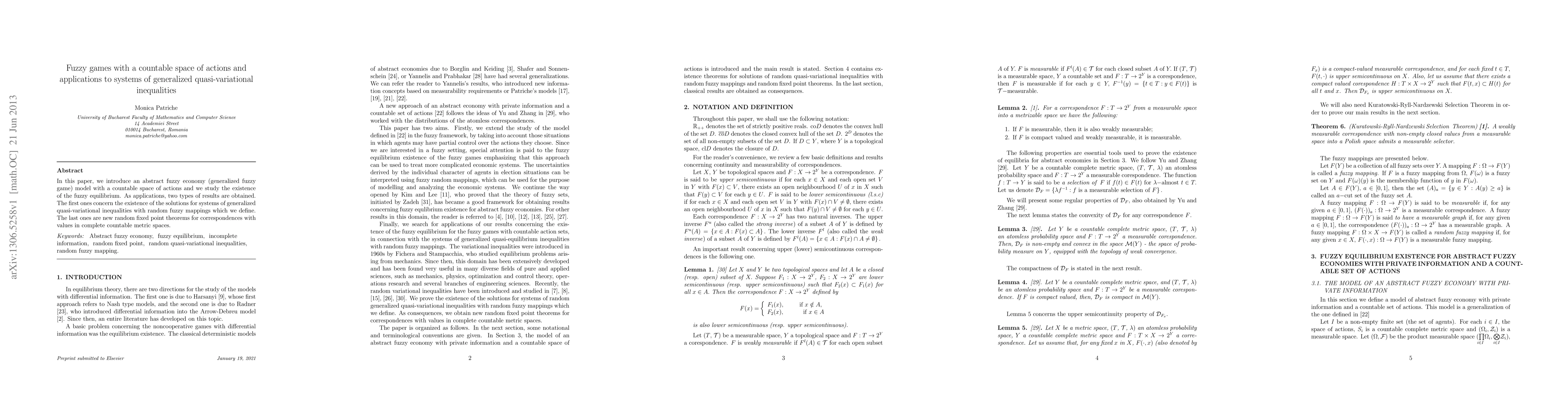 This paper introduces a fuzzy economy model with a countable action space and investigates the existence of fuzzy equilibria. It also presents solutions for generalized quasi-variational inequalities and new random fixed point theorems for correspondences in complete countable metric spaces.
