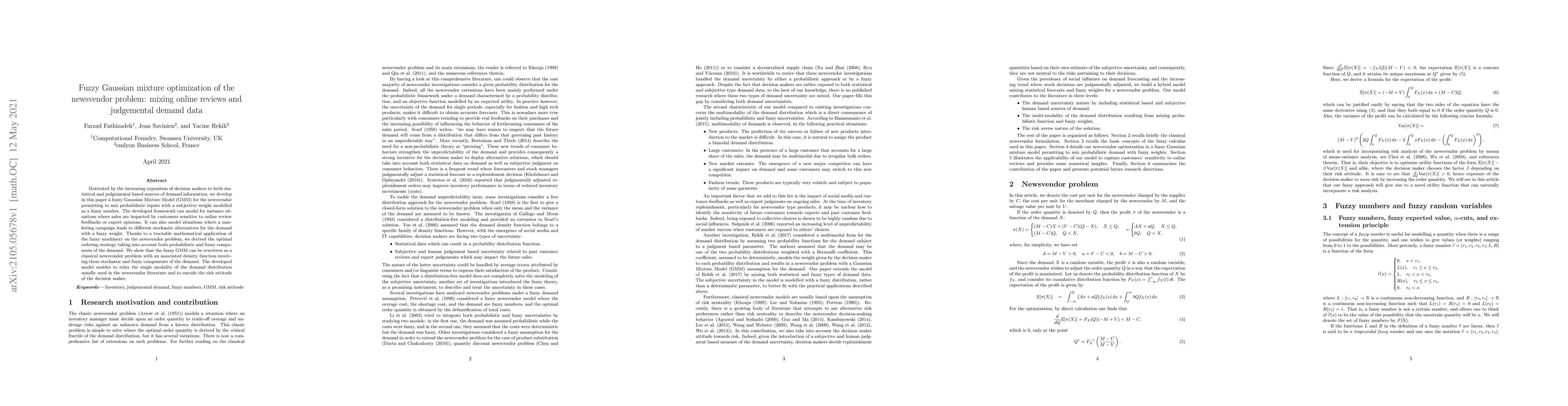 Motivated by the increasing exposition of decision makers to both statistical and judgemental based sources of demand information, we develop in this paper a fuzzy Gaussian Mixture Model (GMM) for the newsvendor permitting to mix probabilistic inputs with a subjective weight modelled as a fuzzy number. The developed framework can model for instance situations where sales are impacted by customers sensitive to online review feedbacks or expert opinions. It can also model situations where a marketing campaign leads to different stochastic alternatives for the demand with a fuzzy weight. Thanks to a tractable mathematical application of the fuzzy machinery on the newsvendor problem, we derived the optimal ordering strategy taking into account both probabilistic and fuzzy components of the demand. We show that the fuzzy GMM can be rewritten as a classical newsvendor problem with an associated density function involving these stochastic and fuzzy components of the demand. The developed model enables to relax the single modality of the demand distribution usually used in the newsvendor literature and to encode the risk attitude of the decision maker.