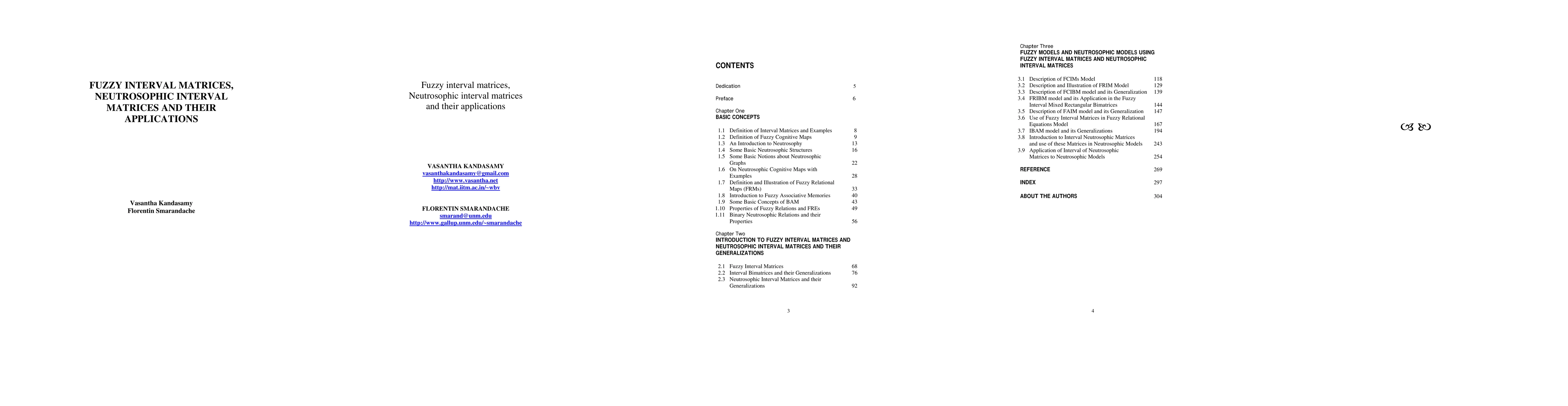 The new concept of fuzzy interval matrices has been introduced in this book for the first time. The authors have not only introduced the notion of fuzzy interval matrices, interval neutrosophic matrices and fuzzy neutrosophic interval matrices but have also demonstrated some of its applications when the data under study is an unsupervised one and when several experts analyze the problem. Further, the authors have introduced in this book multiexpert models using these three new types of interval matrices. The new multi expert models dealt in this book are FCIMs, FRIMs, FCInMs, FRInMs, IBAMs, IBBAMs, nIBAMs, FAIMs, FAnIMS, etc. Illustrative examples are given so that the reader can follow these concepts easily. This book has three chapters. The first chapter is introductory in nature and makes the book a self-contained one. Chapter two introduces the concept of fuzzy interval matrices. Also the notion of fuzzy interval matrices, neutrosophic interval matrices and fuzzy neutrosophic interval matrices, can find applications to Markov chains and Leontief economic models. Chapter three gives the application of fuzzy interval matrices and neutrosophic interval matrices to real-world problems by constructing the models already mentioned. Further these models are mainly useful when the data is an unsupervised one and when one needs a multi-expert model. The new concept of fuzzy interval matrices and neutrosophic interval matrices will find their applications in engineering, medical, industrial, social and psychological problems. We have given a long list of references to help the interested reader.