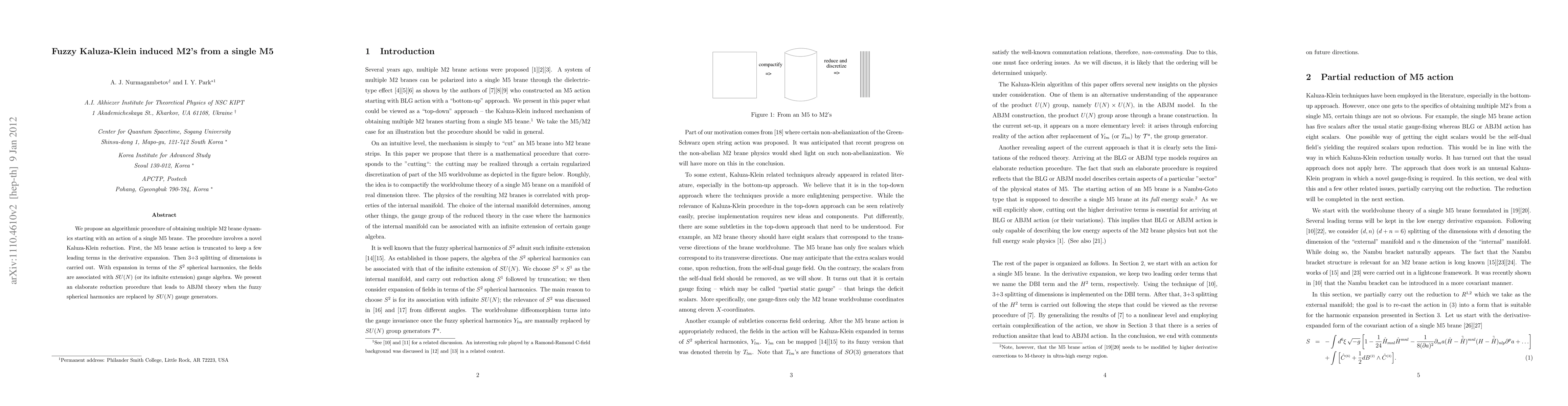 This paper proposes a method to derive multiple M2 brane dynamics from a single M5 brane using a novel Kaluza-Klein reduction. The procedure involves truncating the M5 action and splitting dimensions, leading to the ABJM theory when fuzzy spherical harmonics are replaced by SU(N) gauge generators.